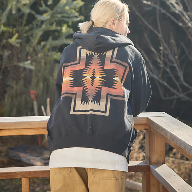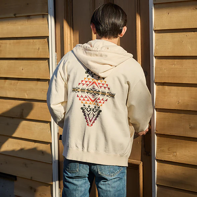 簡潔實用的剪裁搭配大面積背部印花設計,展現出 PENDLETON 特有的美式休閒與戶外生活美學。正面維持俐落素雅,背面圖案融合品牌經典的原住民圖騰與象徵性元素,賦予衣著更豐富的層次與視覺特色。