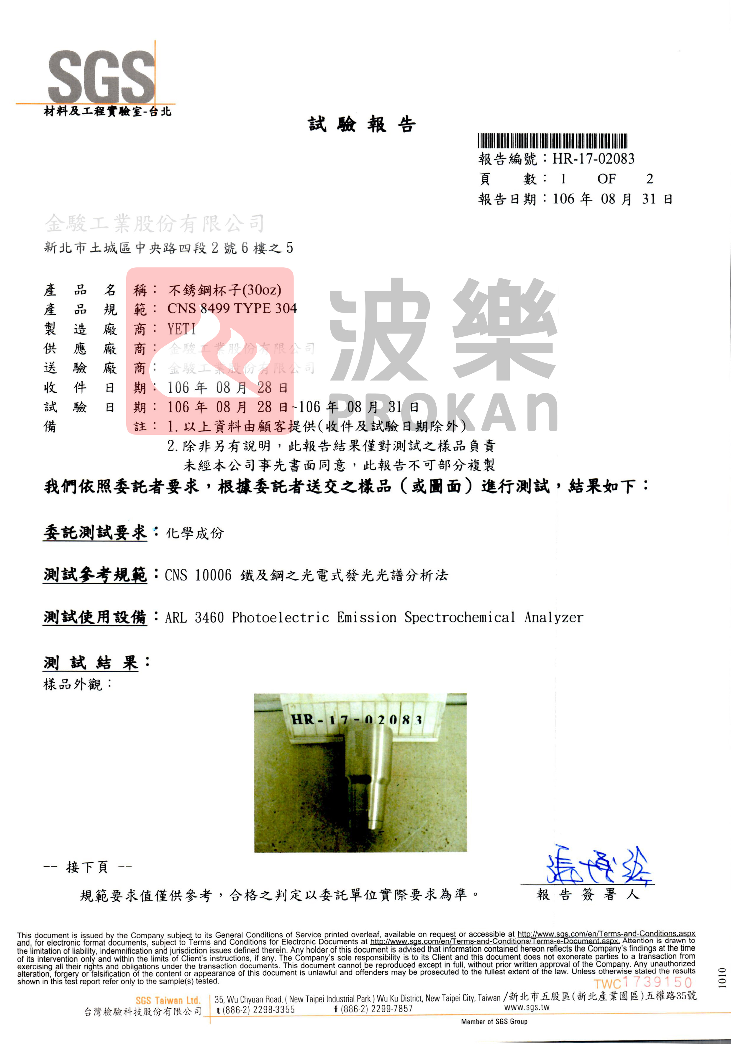 A.杯蓋材質為Tritan,Tritan的耐溫度,沸點為攝氏100度(包含)至零下40度. 具耐用度、透明度,特性為不含環境賀爾蒙-雙酚A(BPA). Tritan通過美國FDA 認證(Food Contact Notification (FCN) No. 729) 。瓶身材質採304(18-8) 不鏽鋼材質,為食品級、醫療級不鏽鋼,具有很強的耐蝕性/耐熱性。