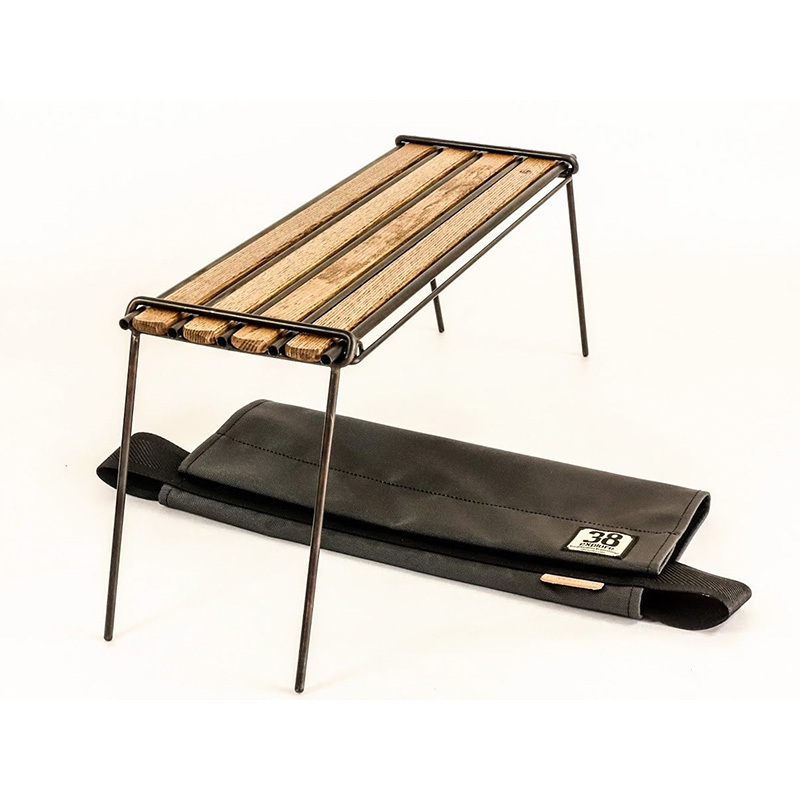 日本製造、質感獨特之多功能折疊式桌板/露營桌,根據不鏽鋼架安裝位置,可加寬桌板使用及吊掛空間;附兩側吊架,可搖身一變成為燈具吊架(適用吊掛輕量式燈具)。收納袋可安裝於桌下,增加收納空間。