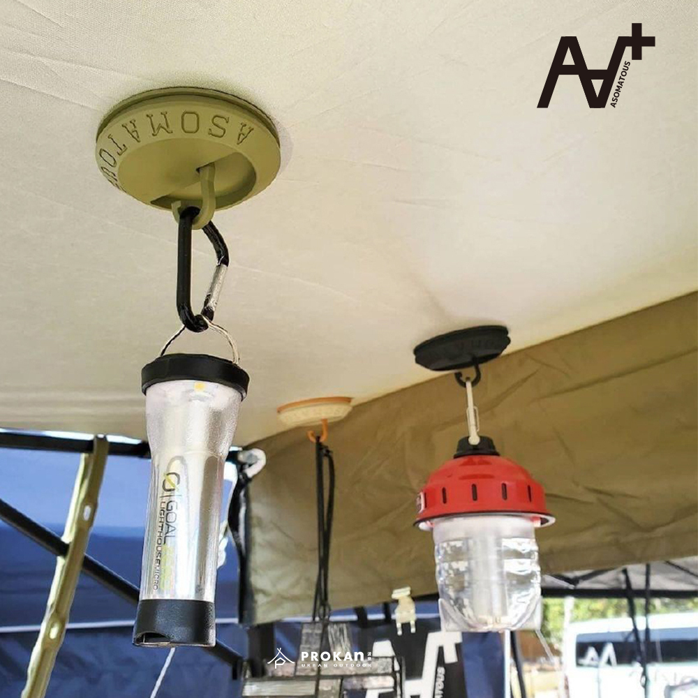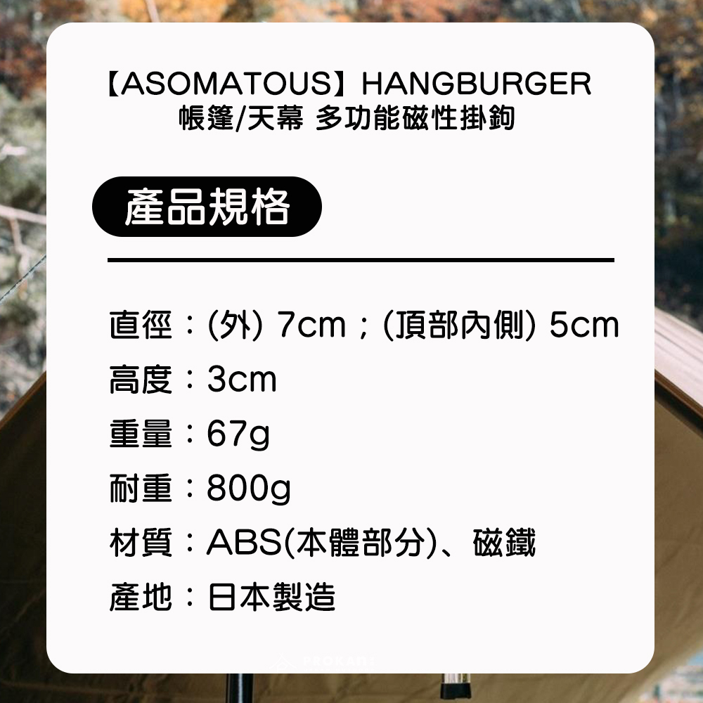 ASOMATOUS HANGBURGER,一款多功能、使用方便的磁鐵掛鉤,可用於帳篷、天幕、前庭、客廳帳或任何磁鐵可吸附處,隨處增加掛鉤,便於你懸掛營燈、LED燈條、風扇或掛物繩。日本製造,承重約800g。