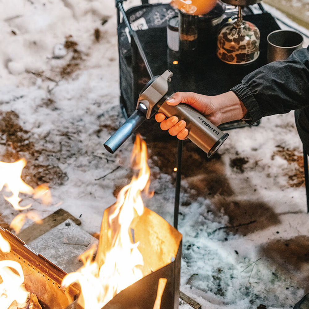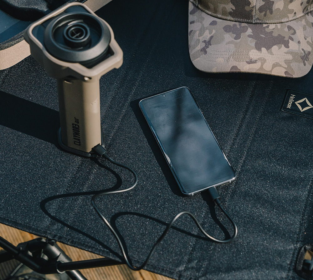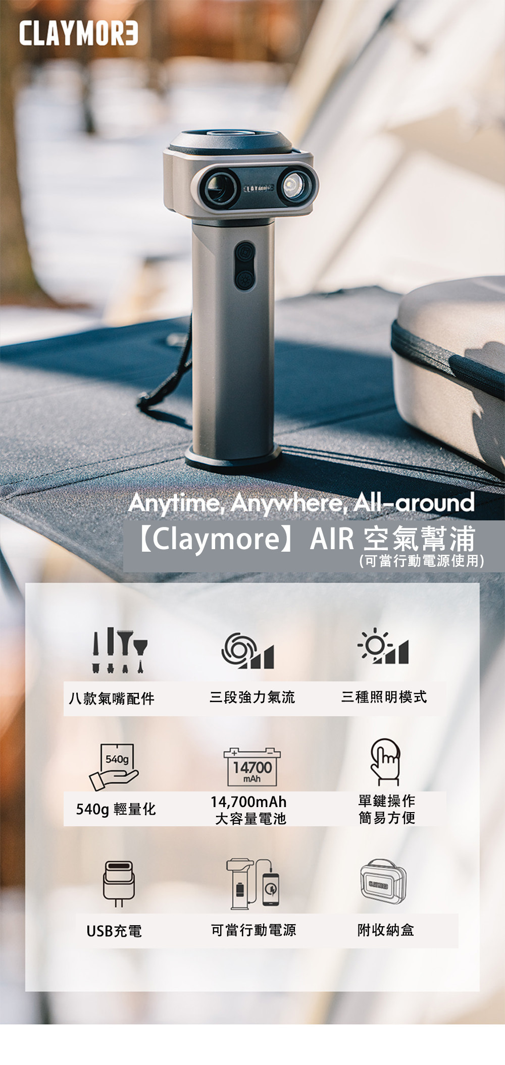 不受場所和使用環境限制,全新無線便攜式【Claymore】AIR 空氣幫浦,內建大容量14,700mAh鋰電池,除具備充氣/抽氣功能外,亦可作為LED營燈和行動電源使用。三段強力氣流及照明亮度,附8種不同類型的空氣噴嘴,可適用於各類型如充氣床墊、點燃營火、清潔露營裝備等用途。