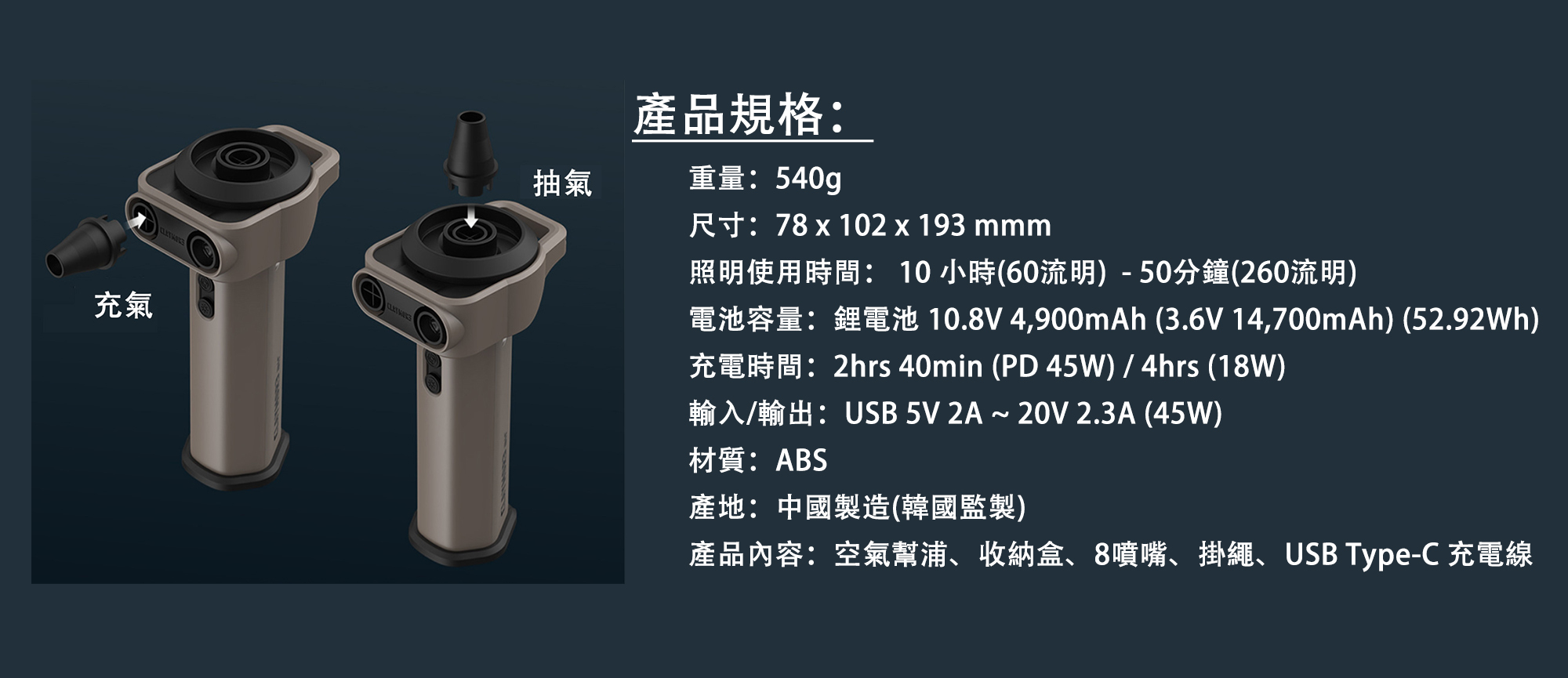 ■多功能用途,具備空氣幫浦、LED燈和行動電源功能