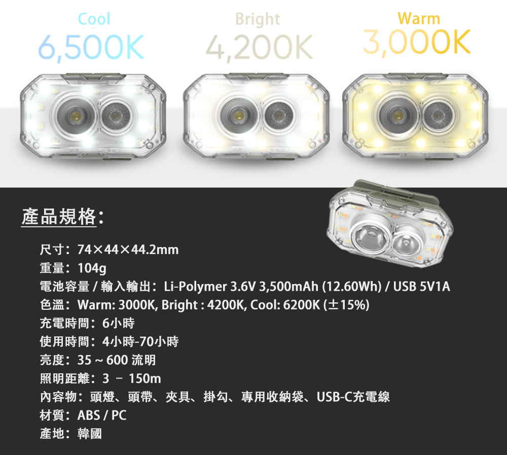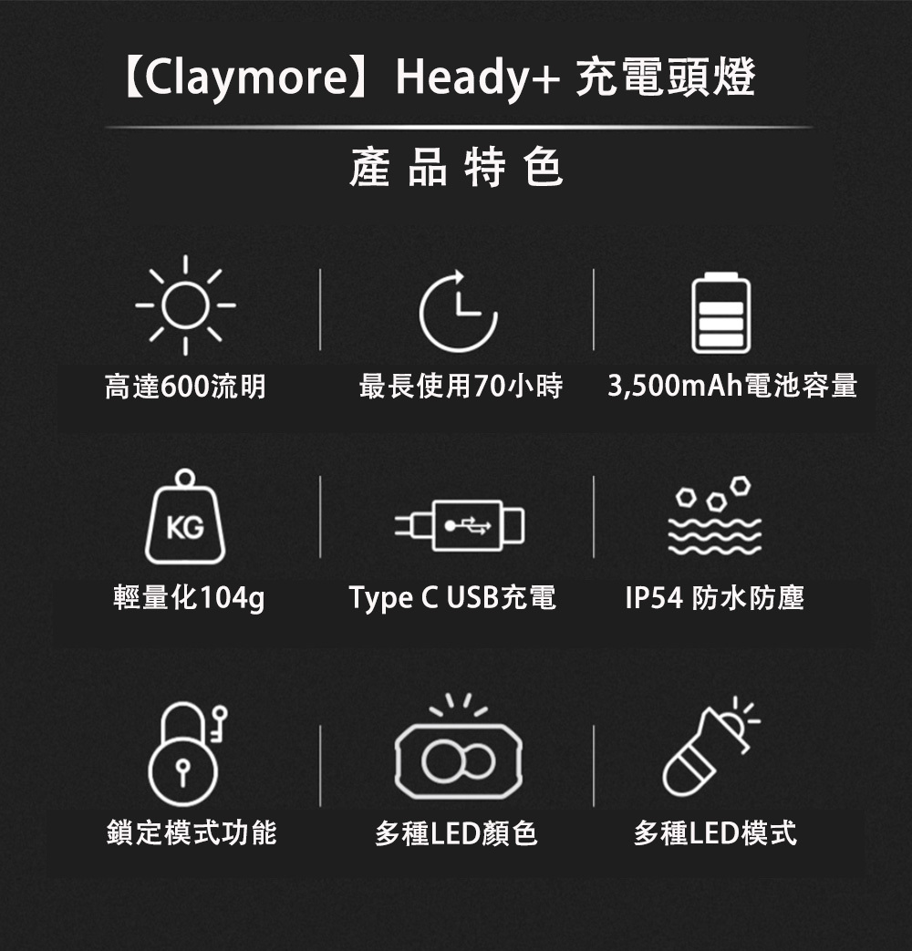 超越頭燈規格【Claymore】Heady+ 充電頭燈,搭配 3,500mAh高容量電池,輕量化設計卻有高達600流明亮度,最遠照射距離150m的多功能LED頭燈。五種光亮模式,最低亮度可使用約70小時;可搭配夾具和腳架使用,適用於登山、釣魚、露營或戶外、各種工作環境。