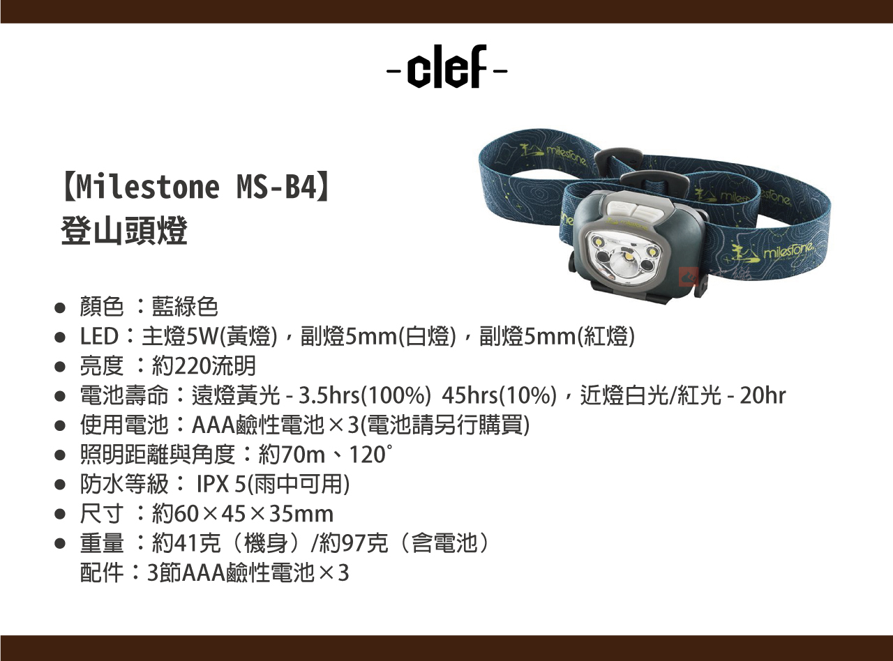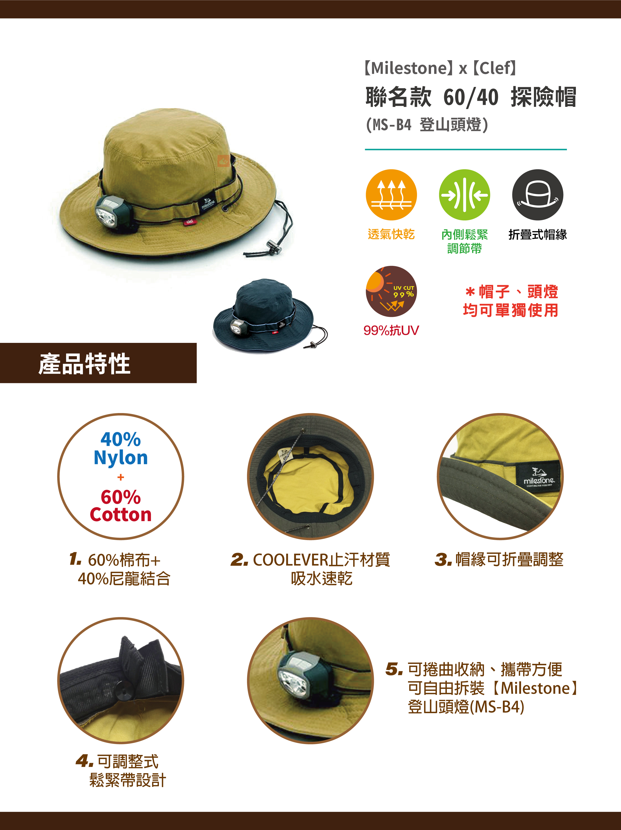 漁夫帽款式,男女可戴,適用於戶外活動、城市通勤等任何場合。採用60%棉布/40%尼龍比例融合布料,材質柔軟舒適且帽沿外側內嵌軟線鋼絲可輕鬆塑型,內側COOLEVER止汗材質,吸水速乾。四季均適用。 可自由拆裝【Milestone】MB-B4專業式登山頭燈於帽子前方,可鎖定頭燈開關,避免誤開消耗電力,搭配搭載紅色 / 白色LED照明,長期使用可降低眼睛疲勞感。