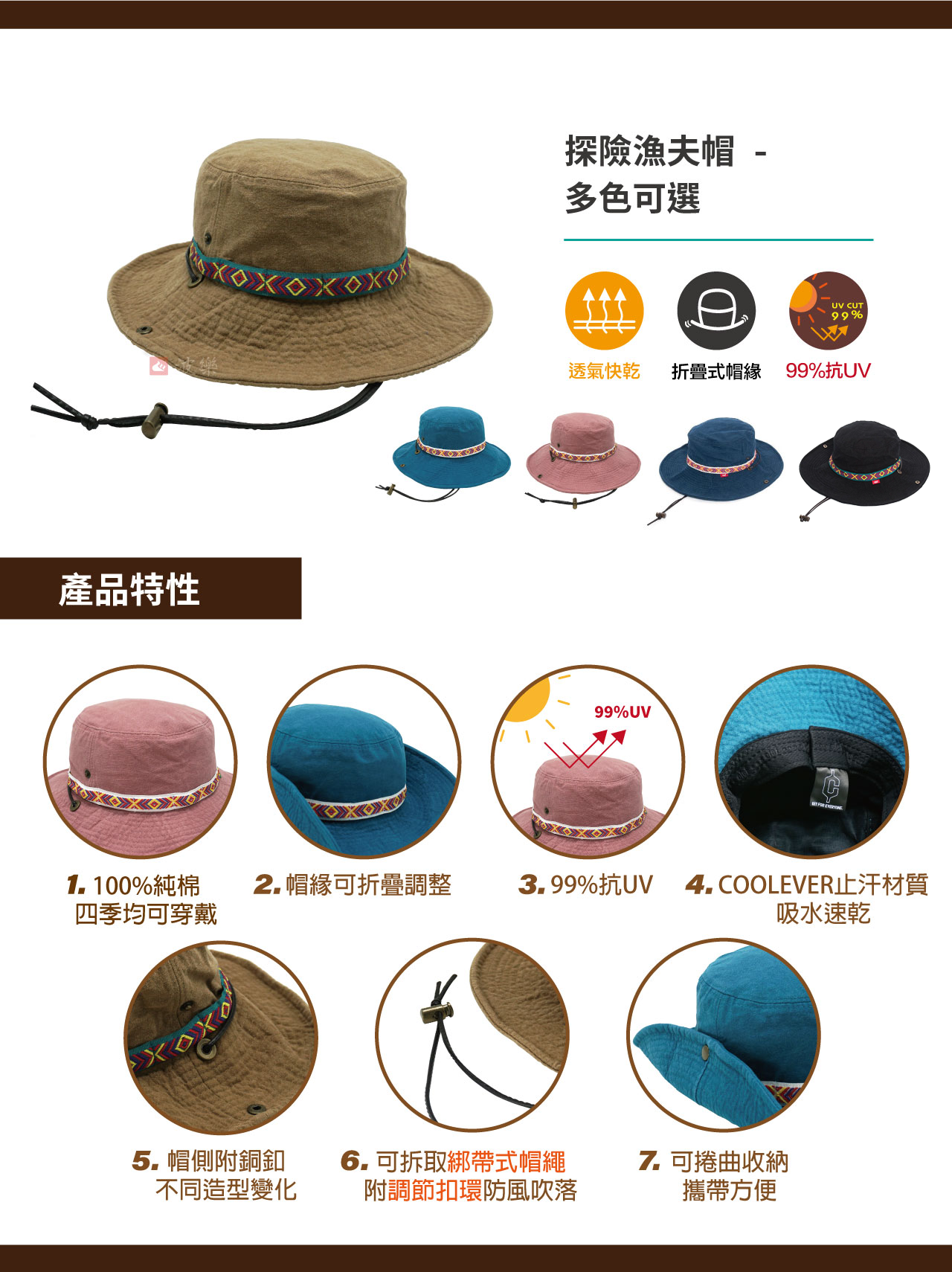 99%抗UV功能,100%純棉材質,舒適柔款適合四季穿戴,沉穩色調搭配民族風圖騰,不論是日常搭配或戶外活動均可適用!帽身內側止汗帶設計,使用 COOLEVER止汗材質可吸水速乾,附調整式帽繩以防風吹落的經典款式設計,深受許多戶外節目拍攝人員所喜愛使用。