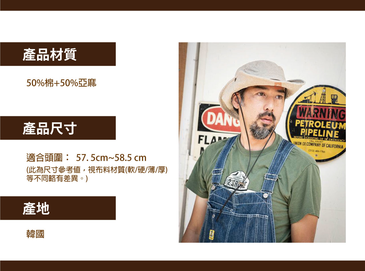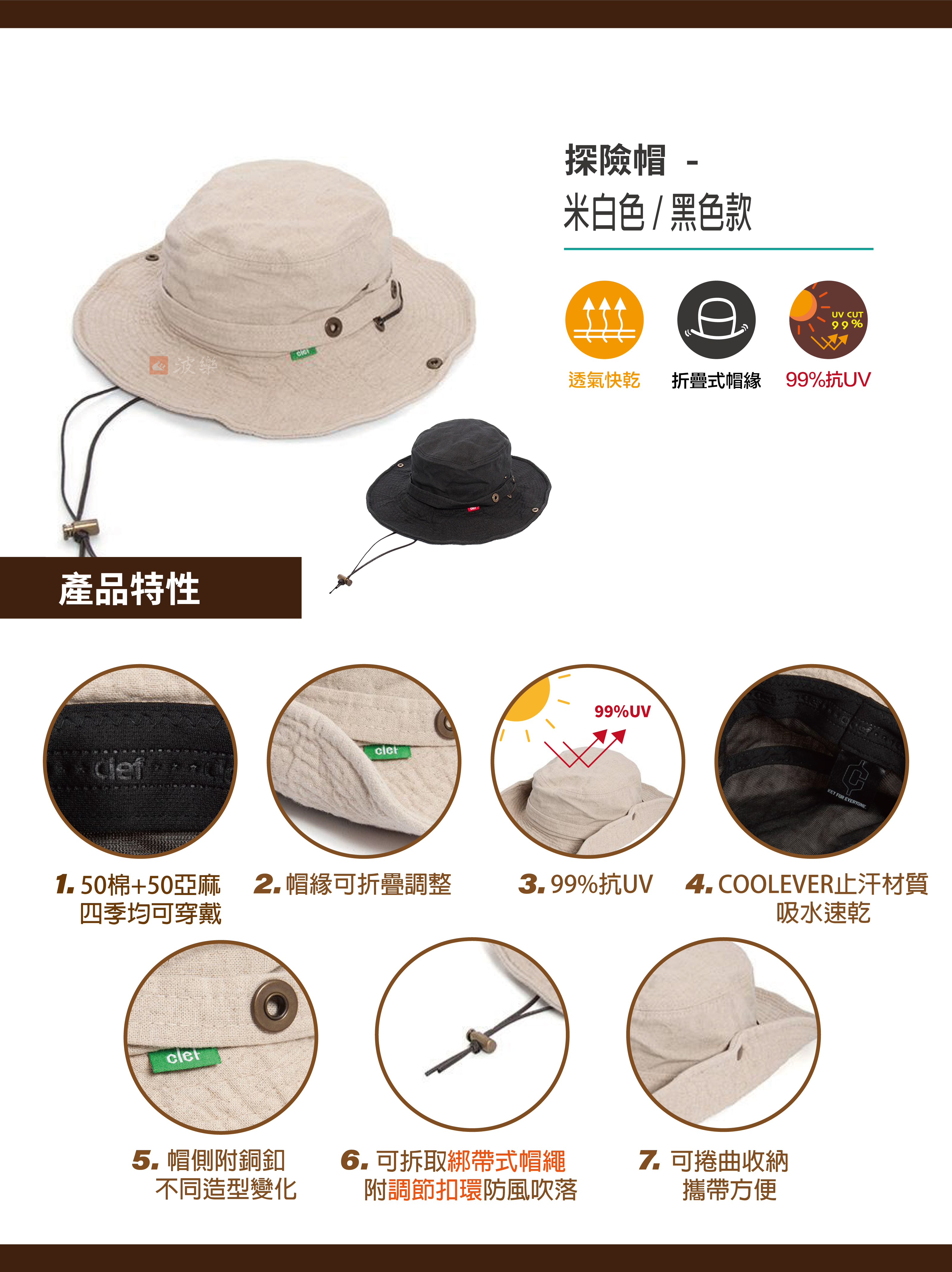 99%抗UV功能,結合50%棉與50%亞麻材質,舒適柔款適合四季穿戴,米白沉靜色調,日常搭配或戶外活動均可適用!帽身內側止汗帶設計,附調整式帽繩以防風吹落,帽沿側多方銅扣的新款式設計,深受消費者喜愛。