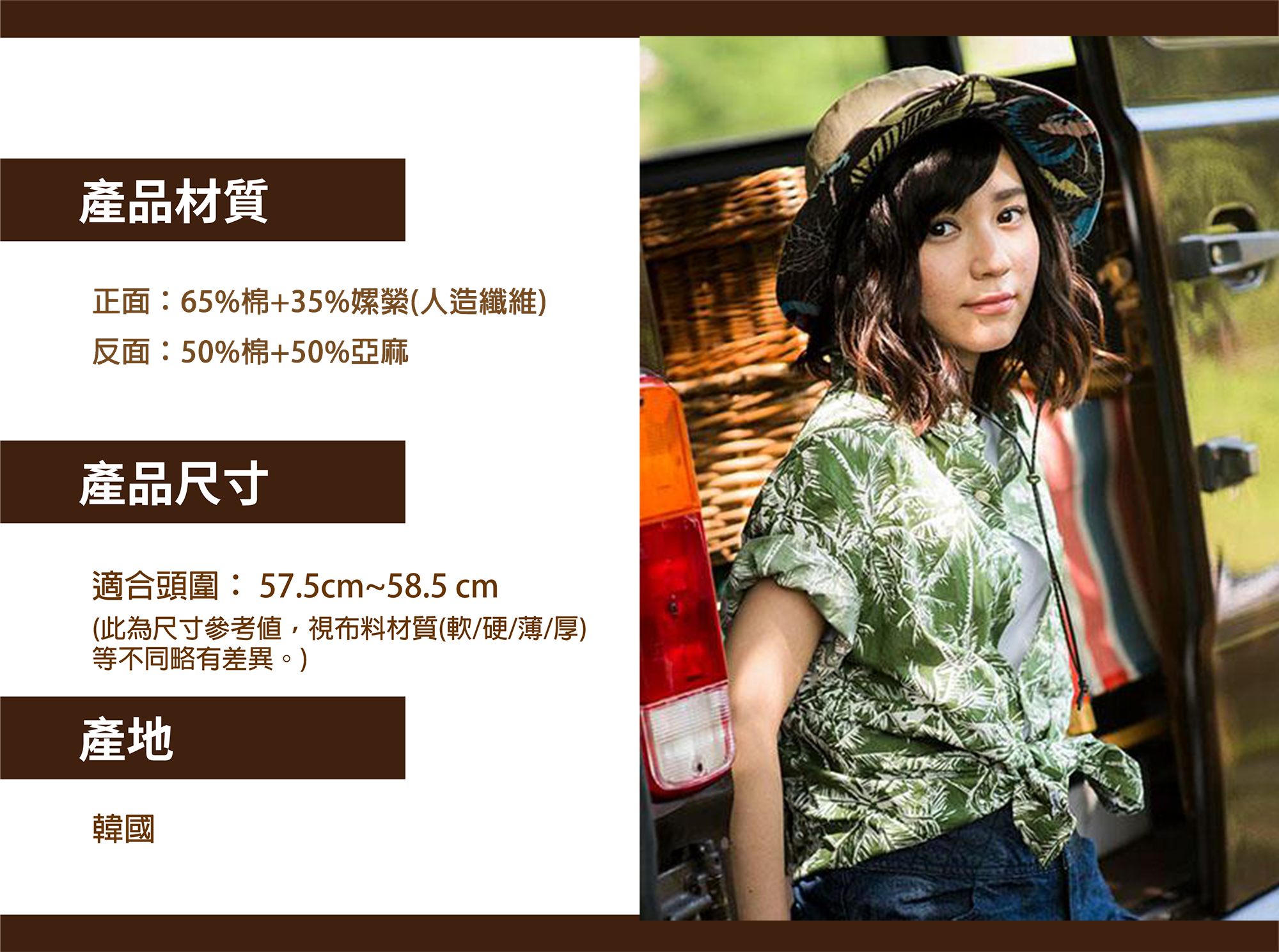 戴著有夏威夷熱帶風情的風尚帽款,彷彿置身於海邊沙灘中的快樂女郎。99%抗UV功能,雙面可戴經典款式,附帽繩防吹落設計,依場合心情自由穿戴出個人不同風格。