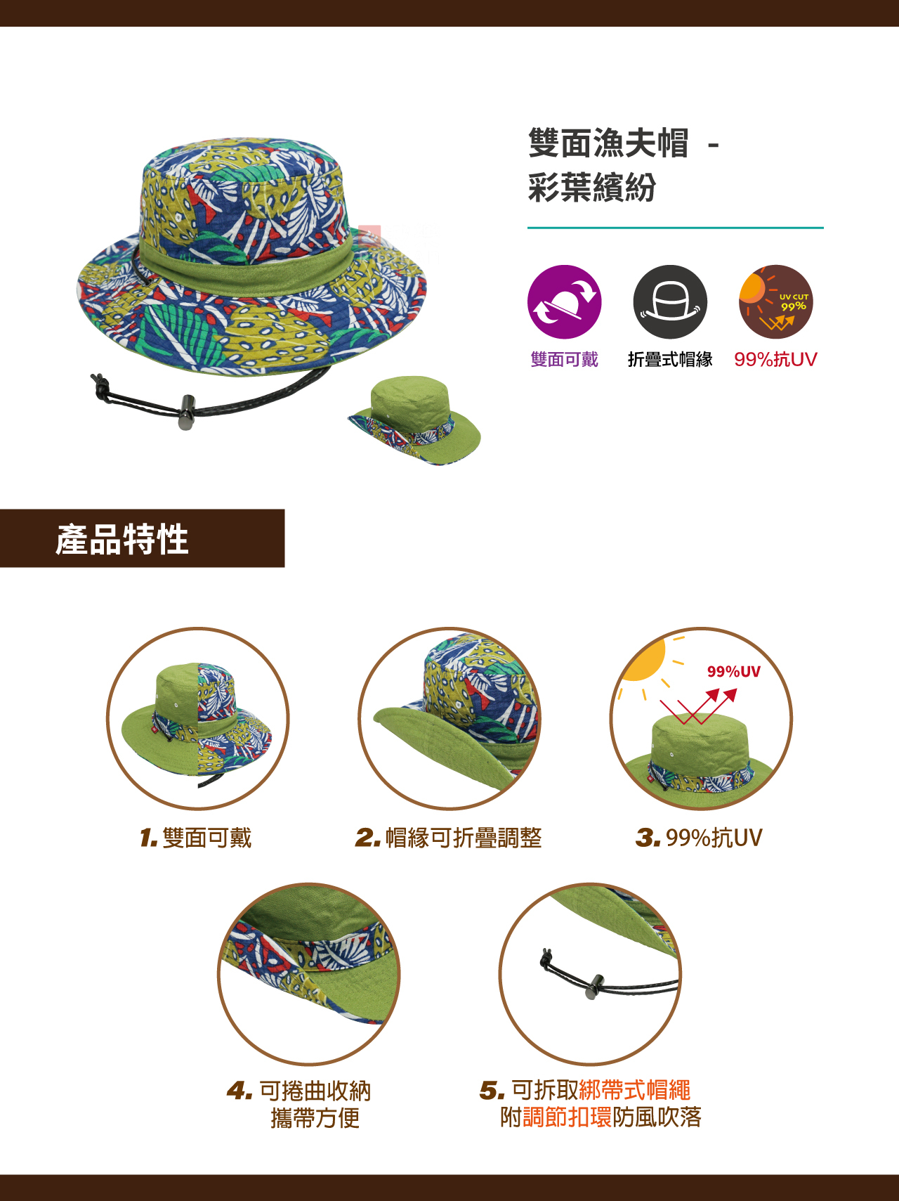 跟著大自然的臉譜-彩色樹葉,來趟冒險之旅吧!男女皆可穿戴,不論是海邊衝浪、戶外活動,都能給你一整天的色彩繽紛好心情。99%抗UV,雙面可戴款式,讓你隨心所欲混搭出自我風格。