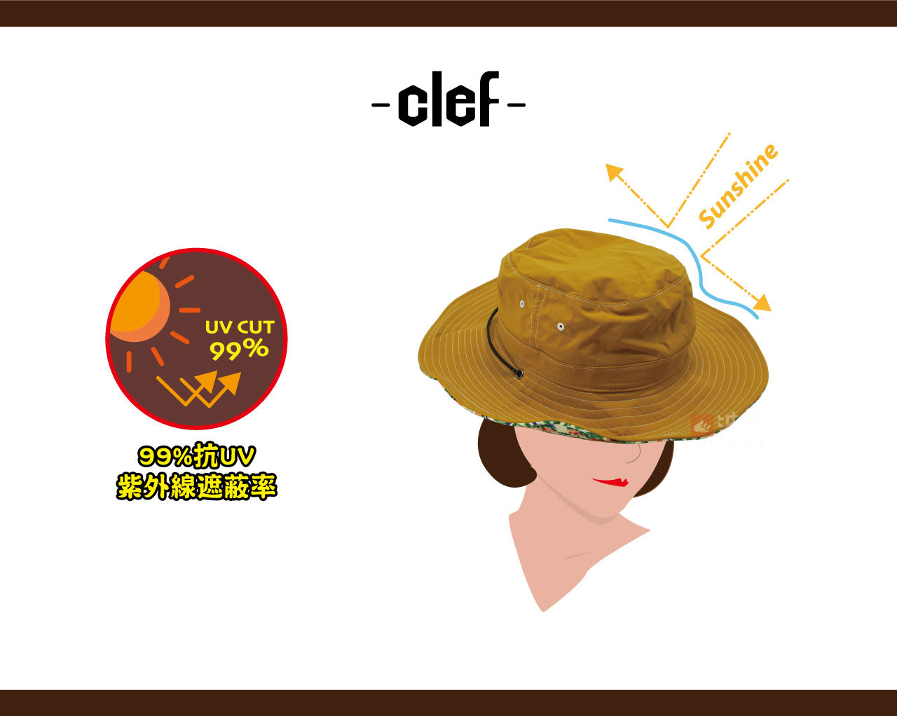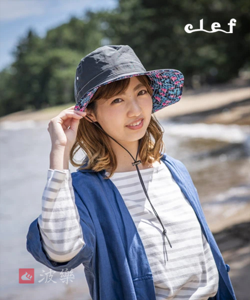 99%抗UV功能,寬帽緣可折疊式設計,具備防曬及修飾臉型的Clef熱銷款式。正面為乾淨明亮的米黃色調,搭配帽簷內側繁花盛開的繽紛色彩,依場合心情自由穿戴出個人不同風格。此款內側有可調整式鬆緊帶設計,附帽繩以防風吹落。