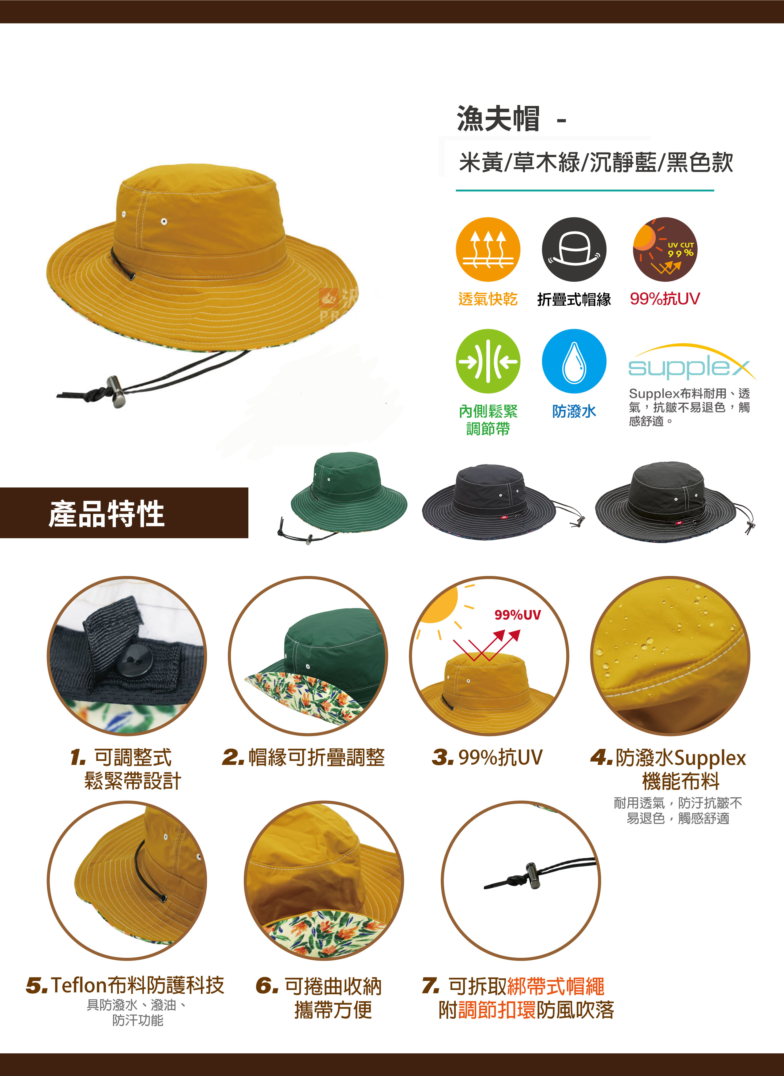 採用防潑水Supplex機能布料,耐用透氣,防汙抗皺不易退色,觸感舒適。同時經過Teflon布料防護科技,具防潑水、潑油、防汗功能。