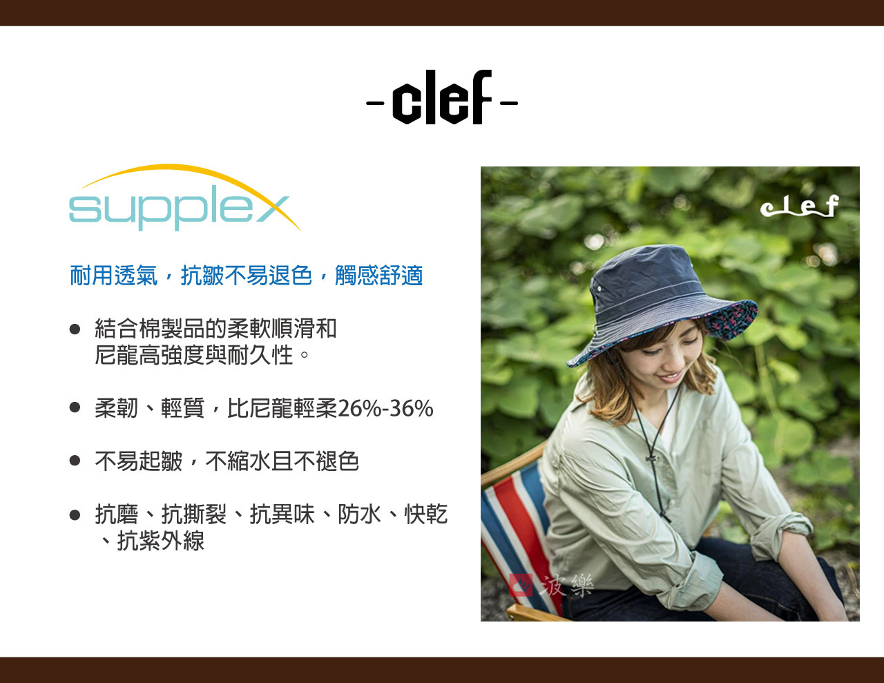 Supplex是英威達(原杜邦)公司特製研發生產的纖維布料,集合了棉製品的柔軟順滑觸感和尼龍的高強度和耐久性於一體的創新纖維材質。精製的空氣變形絲使Supplex柔韌、輕質,而且比標準尼龍特性輕柔26%-36% ; 不易起皺,不縮水且不褪色;使用Supplex布料製成的系列商品,即使經過太陽曝曬、雨淋和反覆洗滌,乾燥後仍將保持原型,且顏色依舊艷麗。另Supplex還具備抗磨、抗撕裂、抗異味、防水、快乾、抗紫外線等多種功能。