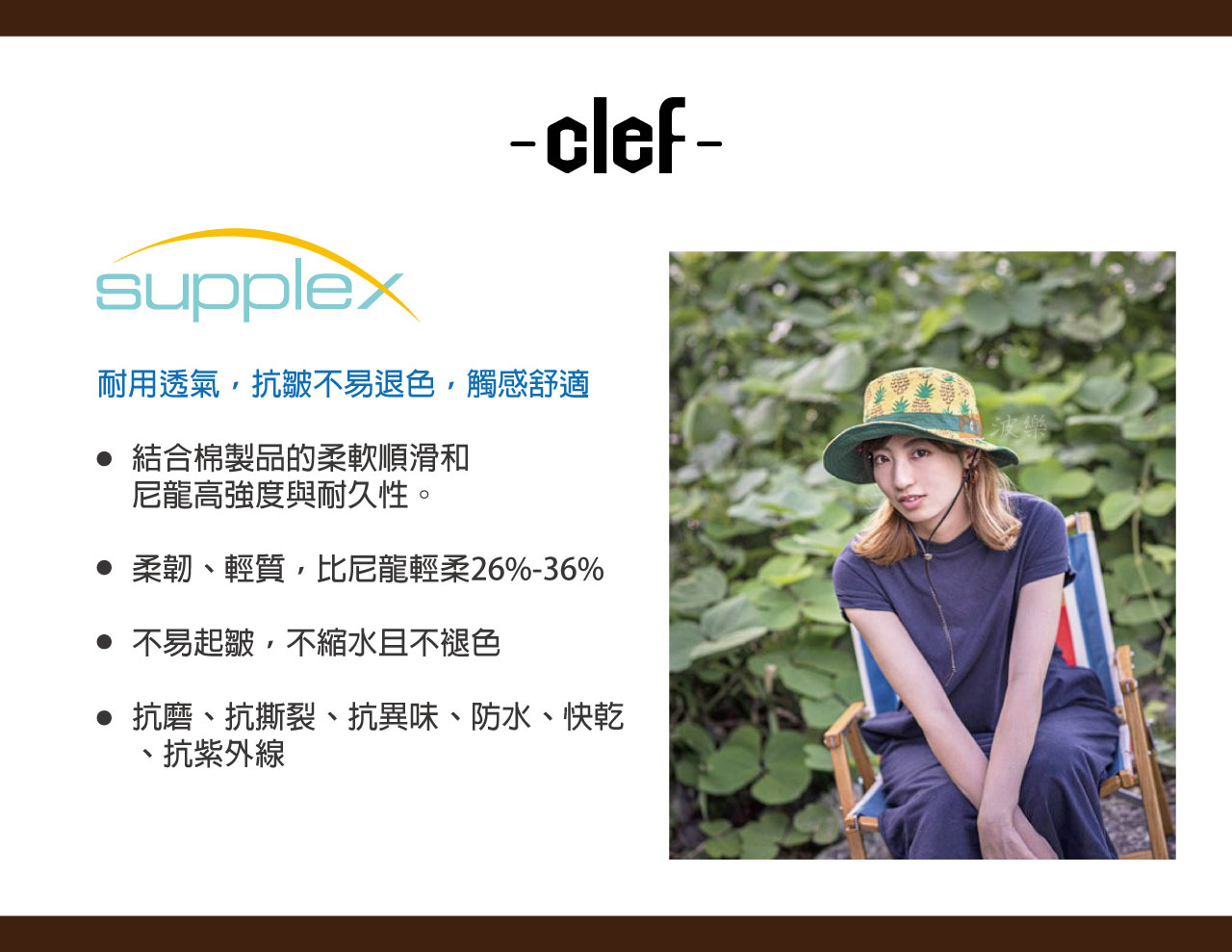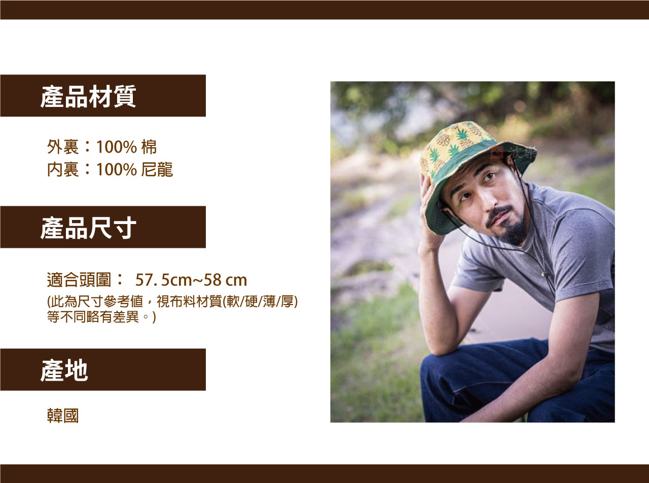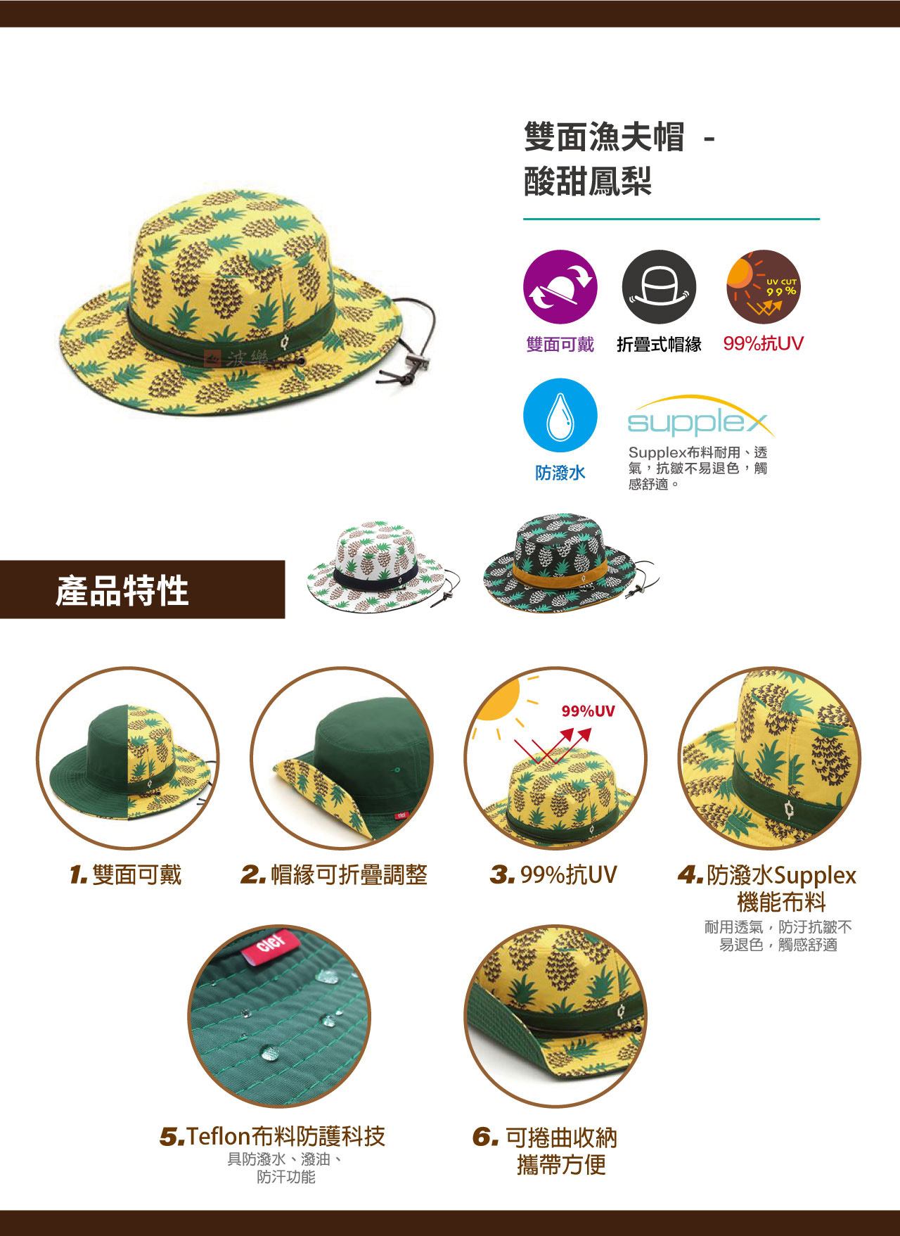 酸酸甜甜的鳳梨在蔥鬱綠葉中閃閃發亮,為蔚藍天空增添幾許光彩。99%抗UV、帽簷內有線圈可以自由更改形狀。內裡採用防潑水Supplex機能布料,耐用透氣,觸感舒適,下雨也不怕。同時經過Teflon布料防護科技,具防潑水、潑油、防汗功能。
