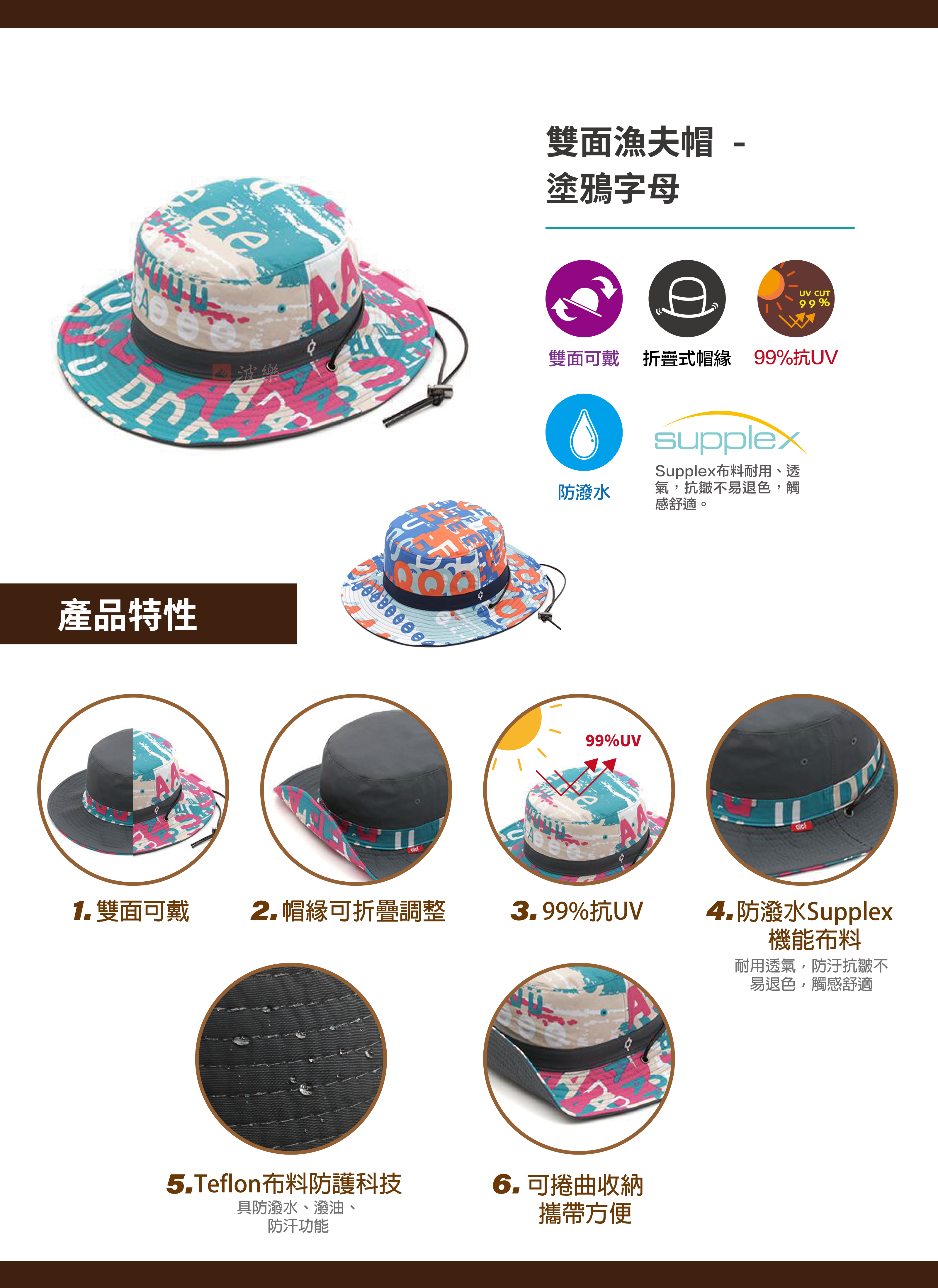 戴上有趣流行的塗鴉字母雙面帽,一起出遊吧!99%抗UV、內裡採用防潑水Supplex機能布料,耐用透氣,觸感舒適,下雨也不怕。同時經過Teflon布料防護科技,具防潑水、潑油、防汗等功能,帽簷內有線圈可自由塑形,穿搭出自我風格。