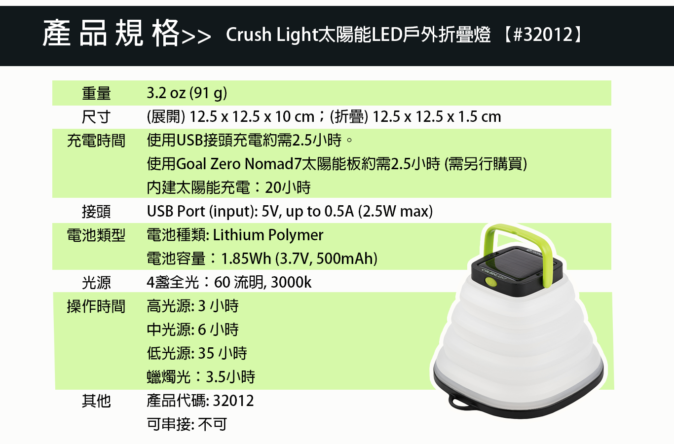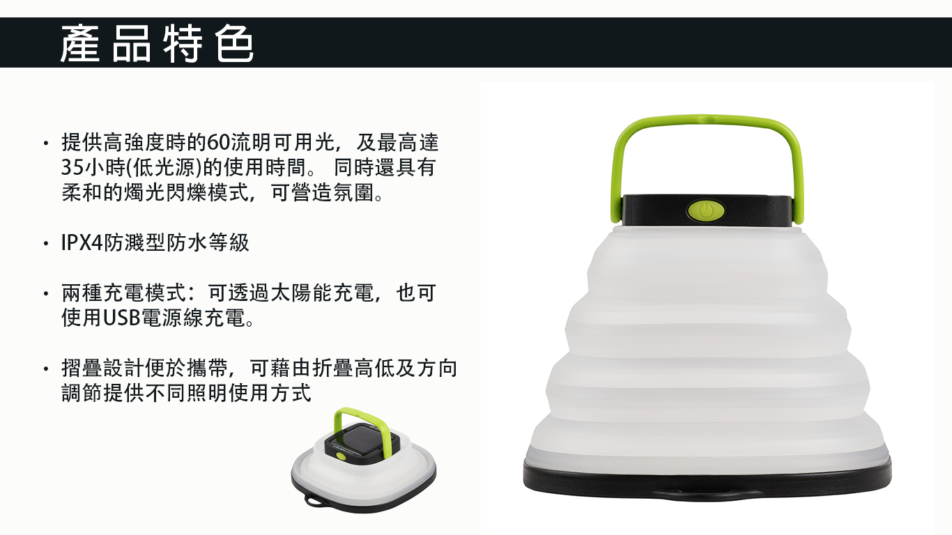一款多元便利的太陽能LED戶外摺疊燈,可懸掛、置放及摺疊收納,具備三種光源設置和閃爍的照明模式,適合任何冒險活動的輕巧伴侶,。