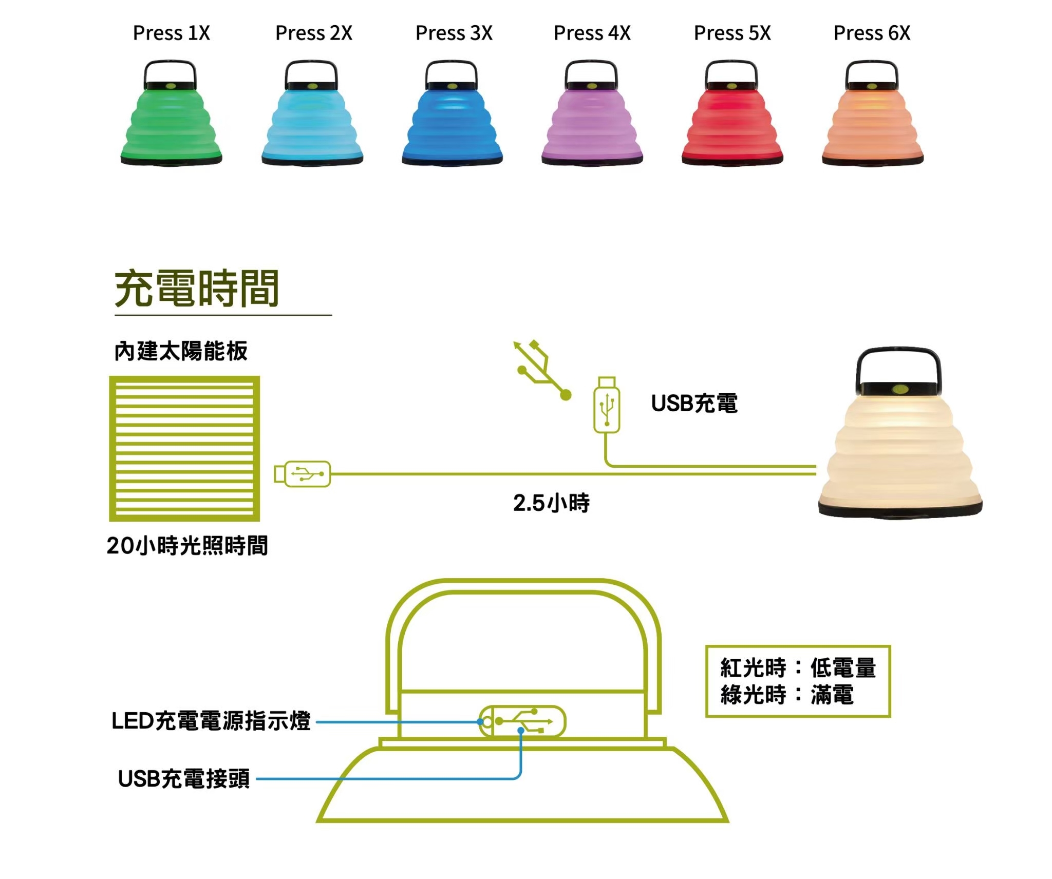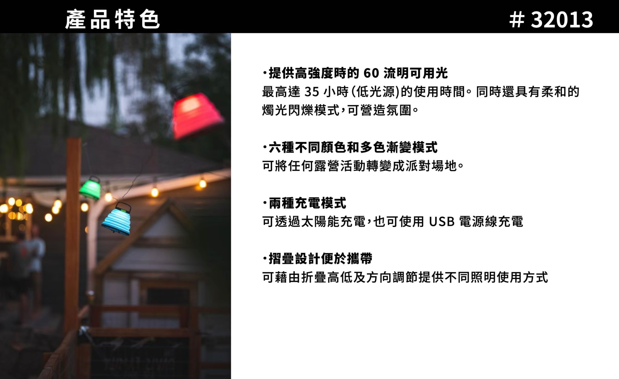 l 六種不同顏色和多色漸變模式,可將任何露營活動轉變成派對場地。