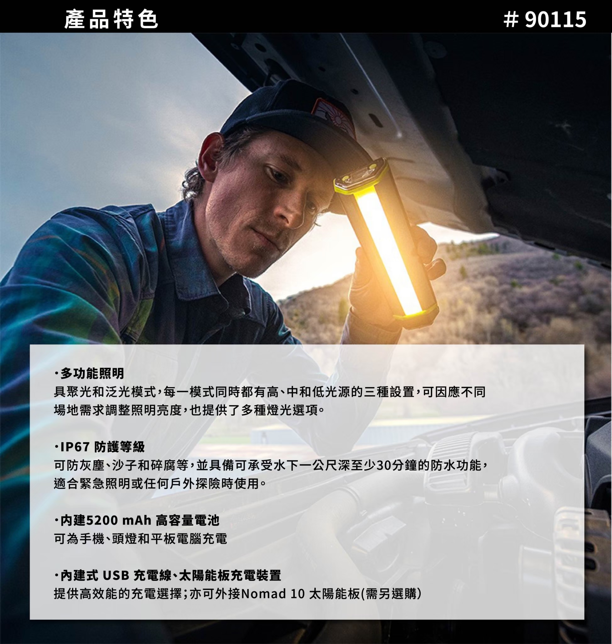 l 內建式USB充電線、太陽能板充電裝置,提供高效能的充電選擇;亦可外接Nomad 10太陽能板(需另選購)。