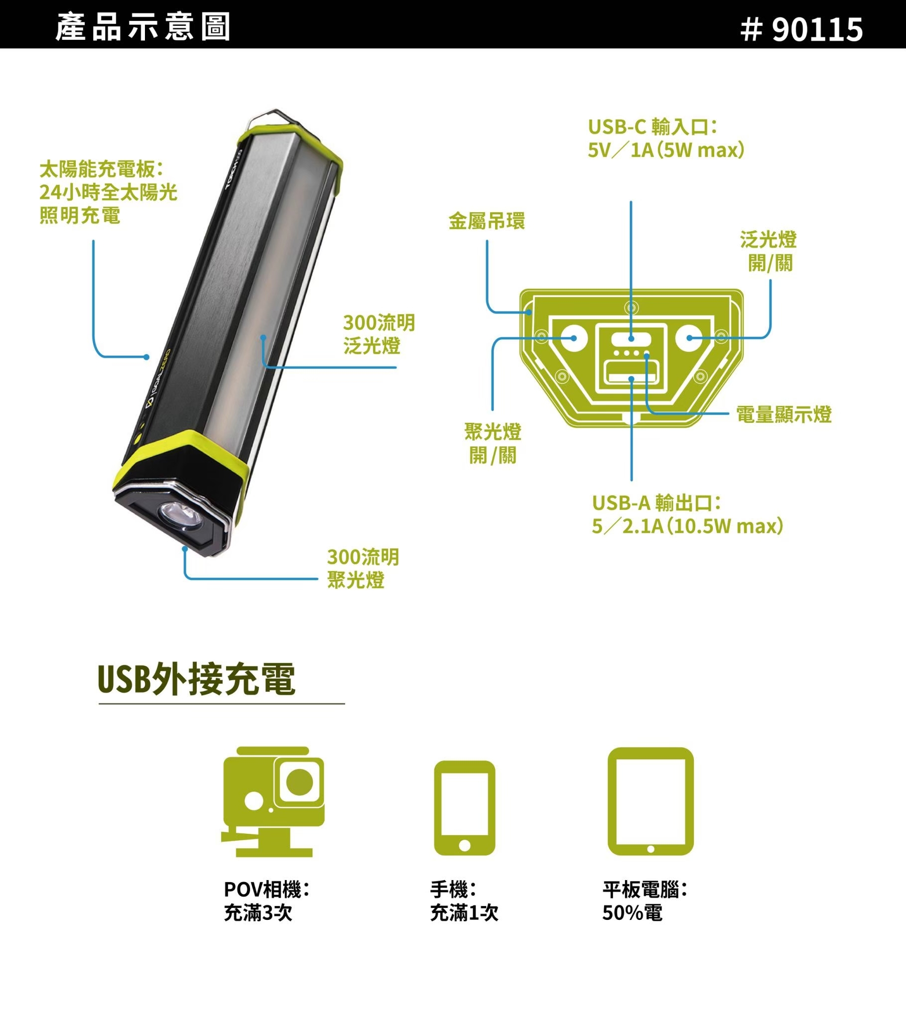 l 內建5200 mAh 高容量電池,可為手機、頭燈和平板電腦充電。