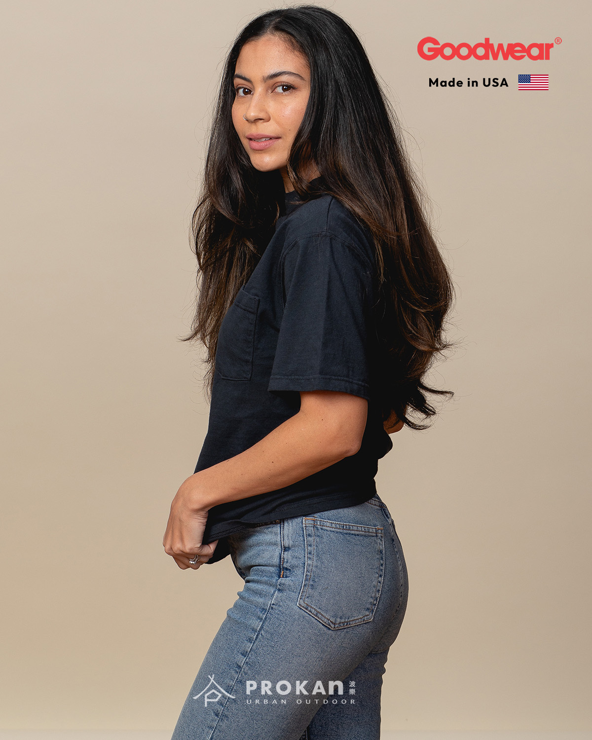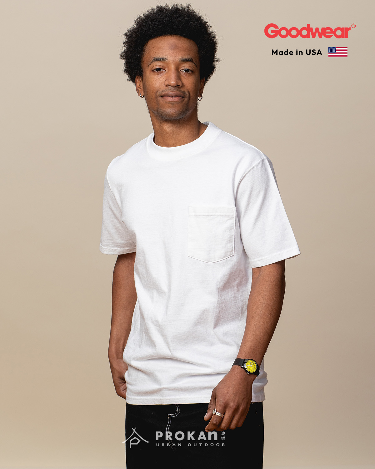 1988年,Goodwear首次推出經典短T款式,有口袋與素Tee兩款。約3.5cm(1.25”)寬度適中的棉質羅紋衣領,舒適不勒脖;使用7.2oz厚磅棉製,連袖寬鬆剪裁,經典美版圓筒 Tee一體成形無縫版型,耐穿且修飾身形。100%純棉,美國生產製造。