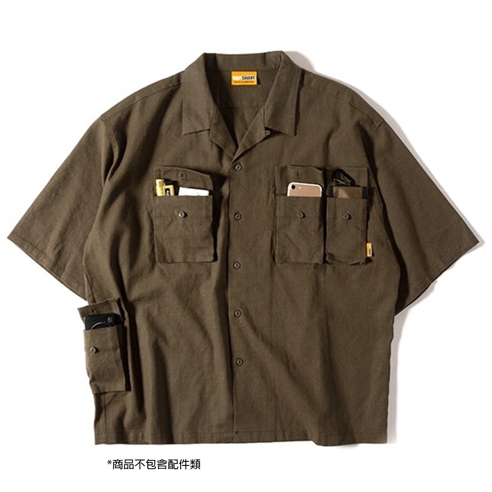一款帶有軍風粗獷感的立領露營襯衫,亞麻棉質混搭材質製成,落肩款加上寬鬆版型,簡約有型、寬鬆又舒適。多側分隔口袋設計,便於置放手機和隨身小物,不用帶小包也可輕鬆出門。