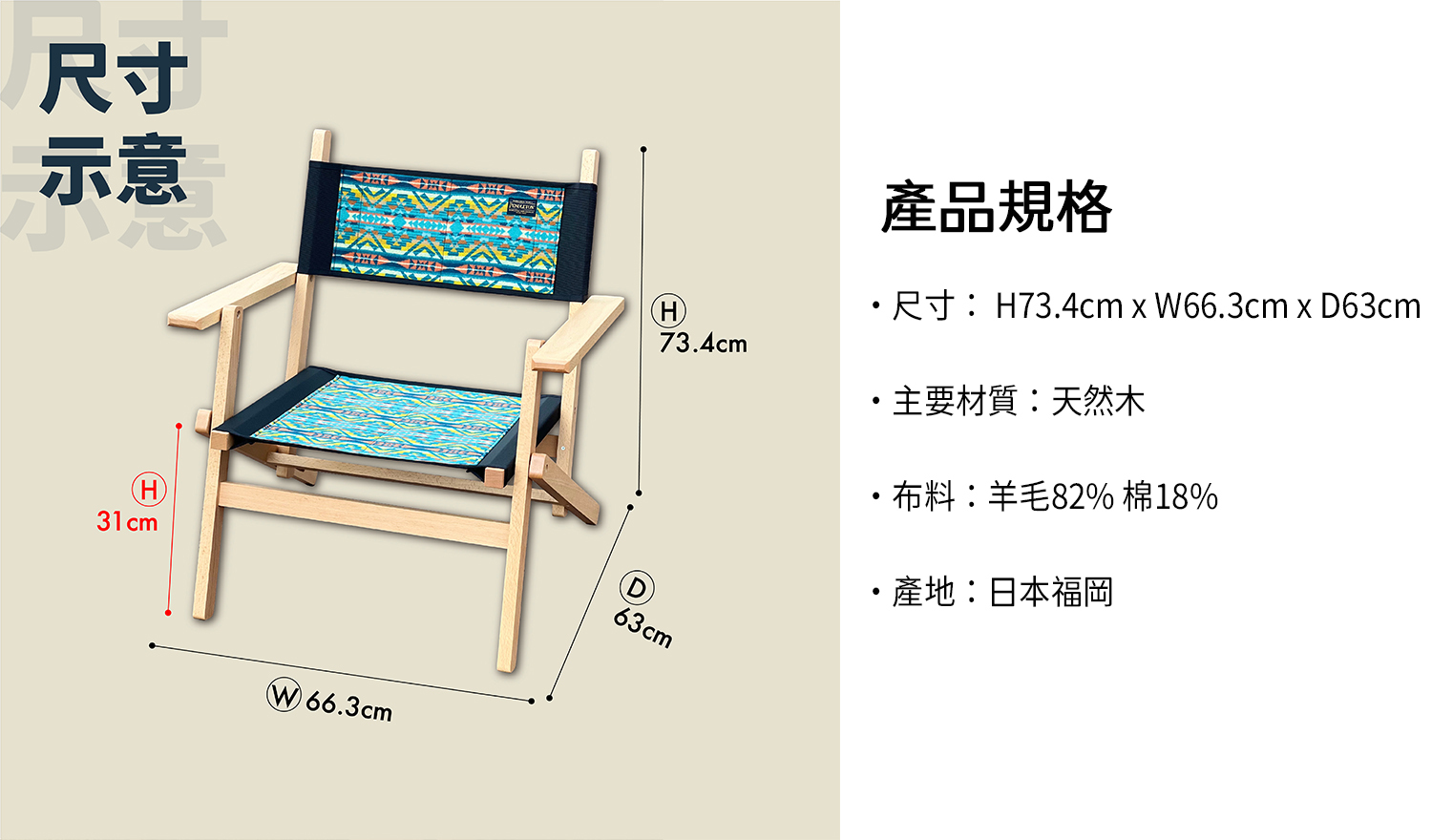 日本製造、一款 PENDLETON 採用高品質羊毛布料,經典圖騰設計,溫暖且充滿質感的木製摺疊座椅。輕鬆摺疊設計,方便攜帶;不僅穩固耐用,坐感舒適且溫暖,讓你無論在室內或戶外,都能享受放鬆的愜意時光。