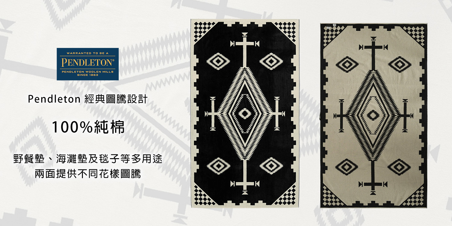 結合西班牙十字架、菱形“眼睛”(ojos)和納瓦霍四山(Navajo Four Mountains)的戲劇性圖騰意象,放置何處都很難忽略此毛巾毯任何環境中都極具戲劇性。一面黑色背景另一面轉變為白色,只有PENDLETON先進技術的製程,才能有如此不同的完美呈現。