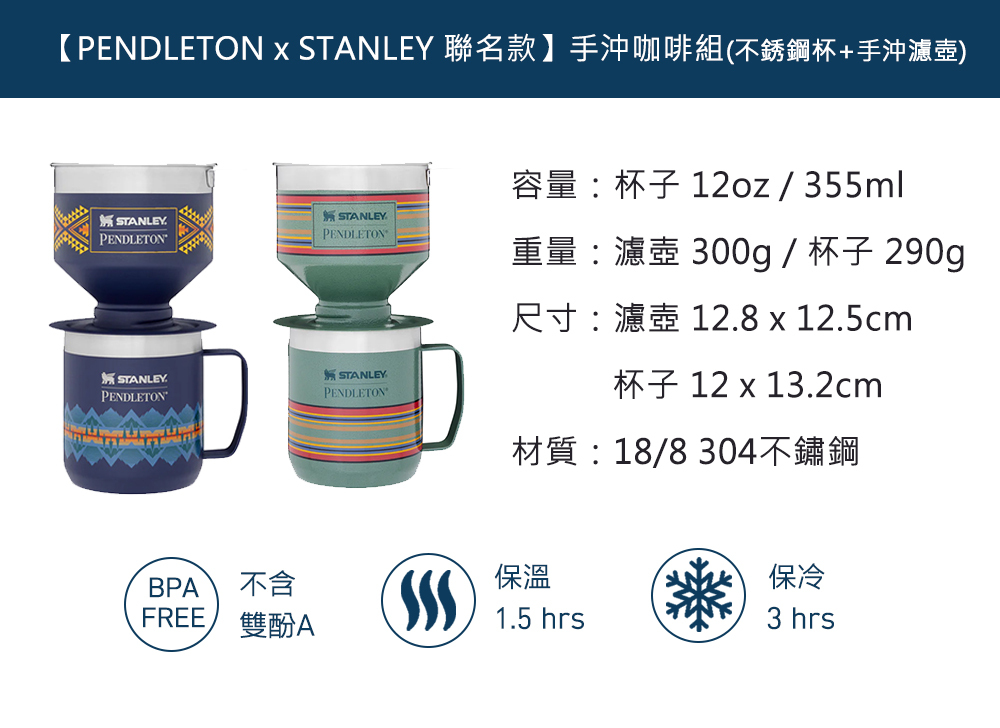 【PENDLETON x STANLEY聯名款】手沖咖啡組,包含一濾壺(約可沖泡1-6杯,無須使用濾掛紙)及12oz不銹鋼露營杯。此款採用改良印刷工藝搭配 PENDLETON 經典圖騰製成,多次清潔洗滌仍能保持色彩鮮艷。18/8不銹鋼製成,不含BPA,可安全使用於洗碗機。