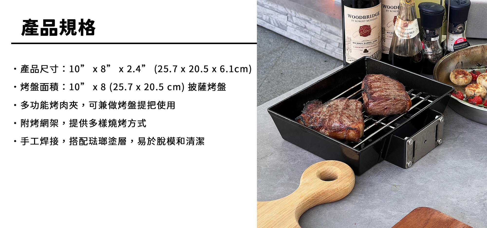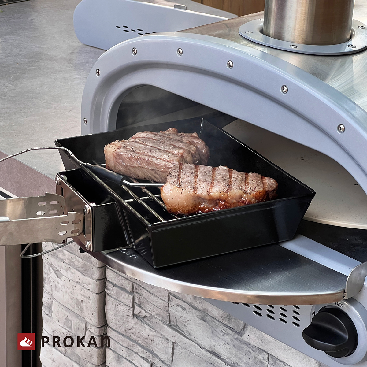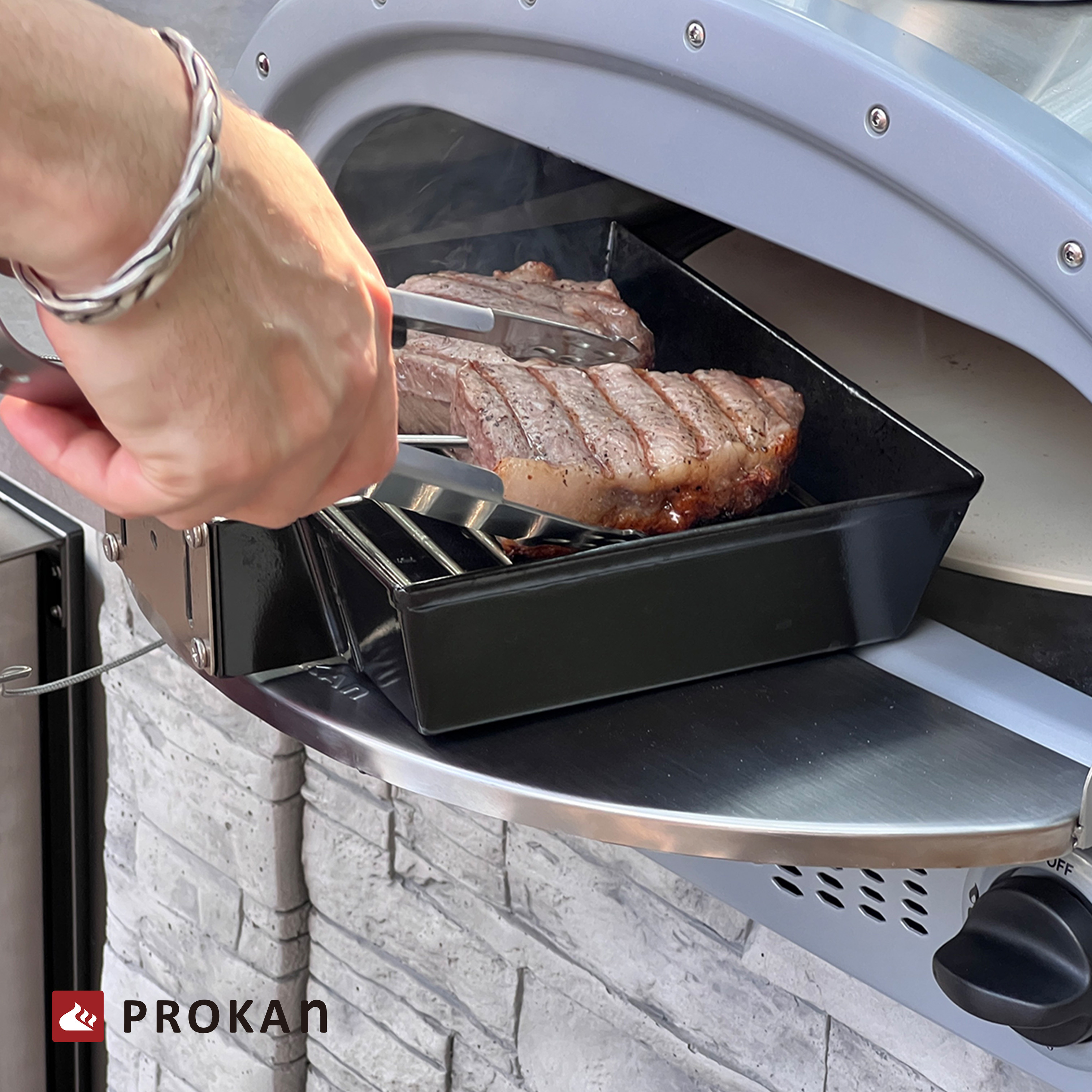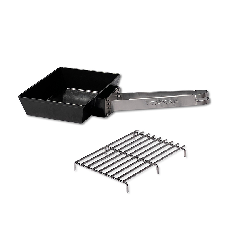 【PROKAN 底特律風格披薩烤盤(鍋)】可單獨使用,另配置一烤網架,讓你有更多不同的燒烤方式,亦可以在烤架下方加入木屑為料理增添額外獨特風味;具雙重用途的多功能烤肉夾,不僅讓你輕鬆處理或翻烤食材,還可以兼作烤盤把手,輕鬆挪移至所需位置。