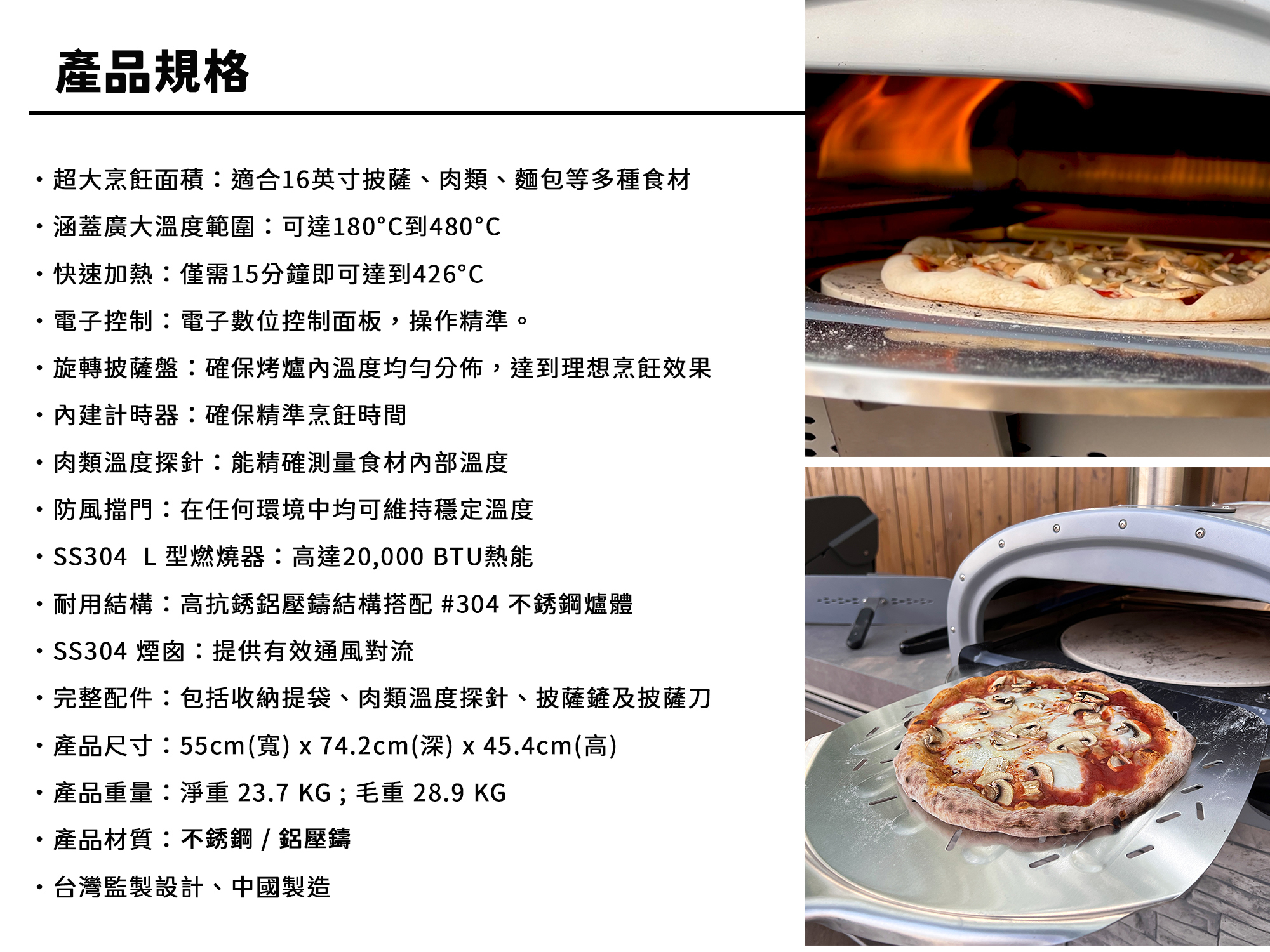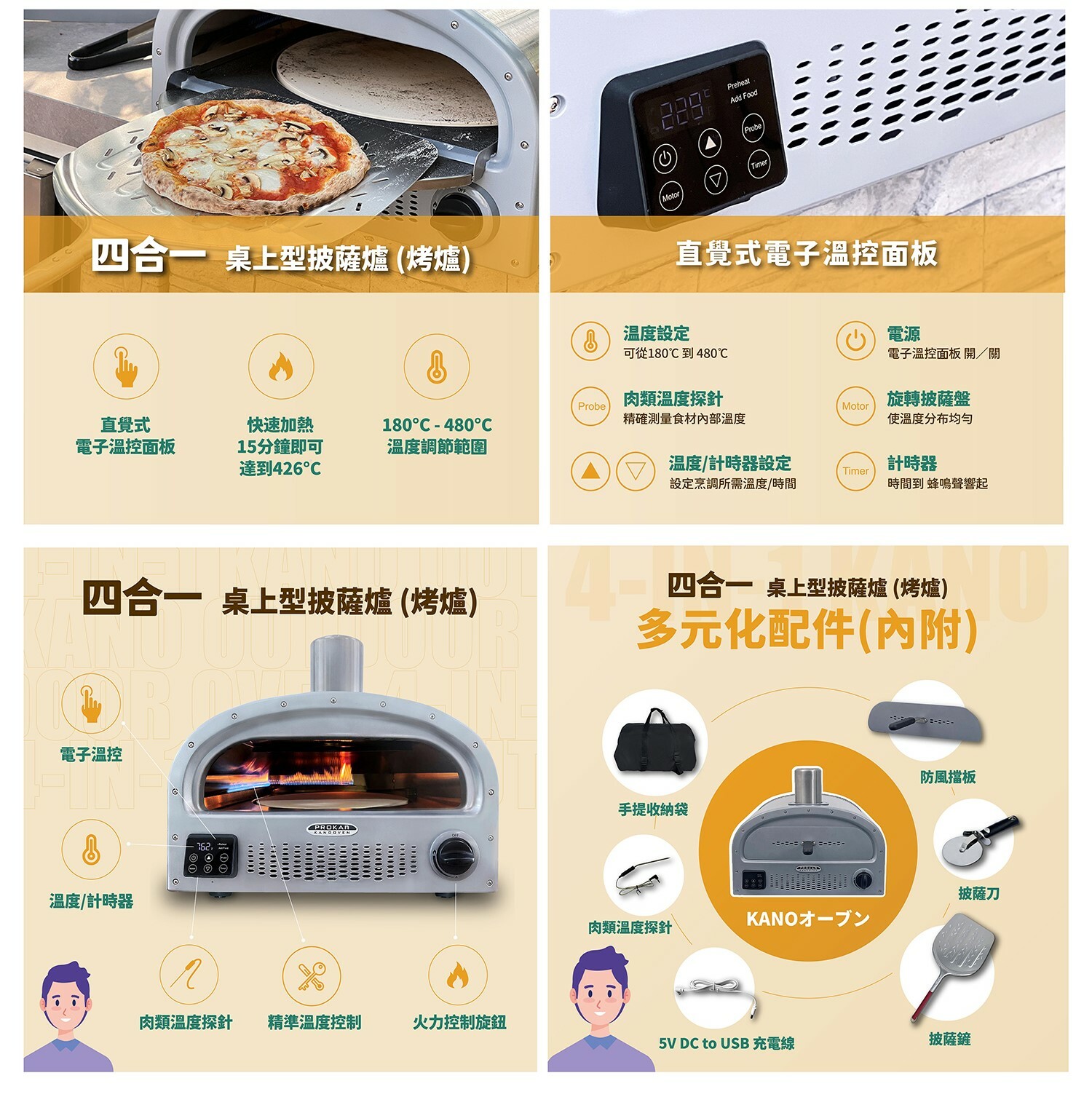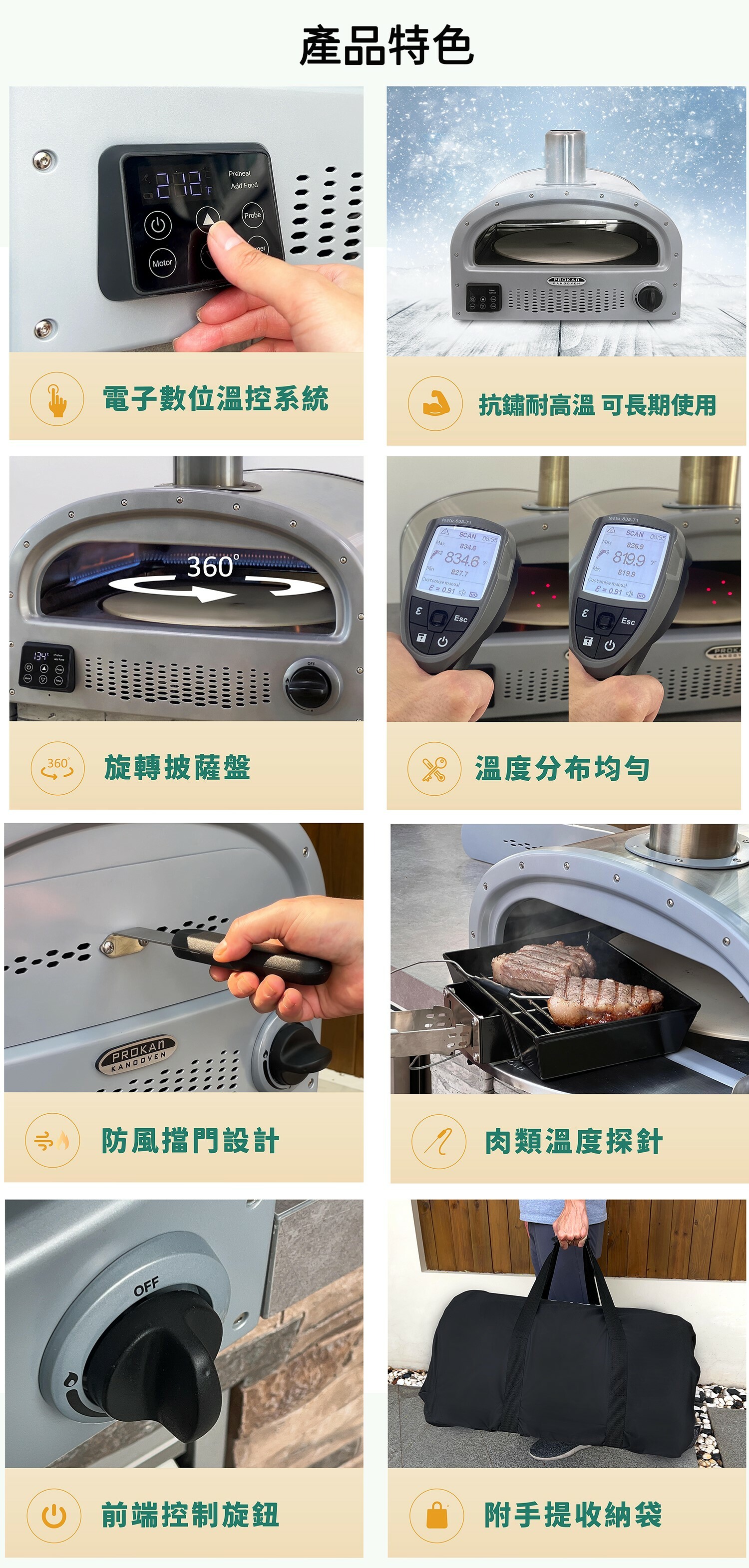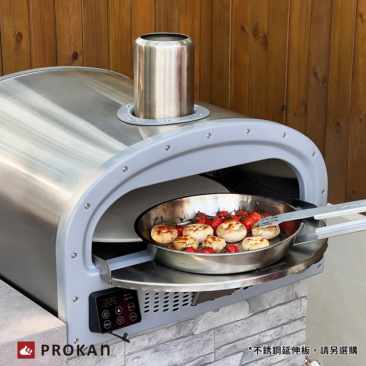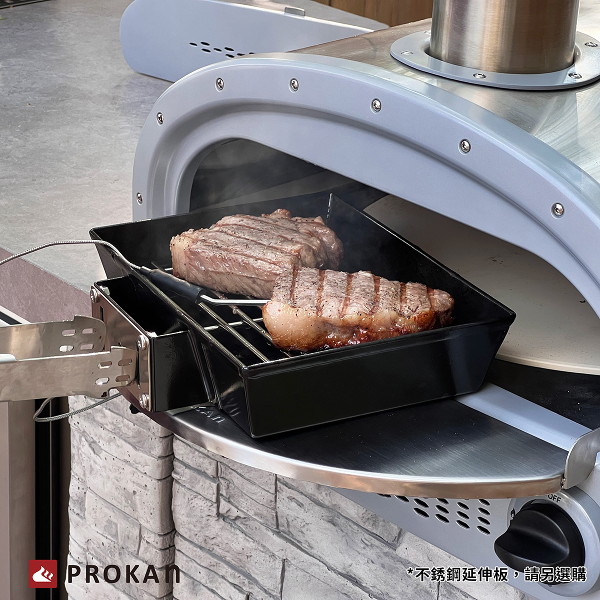 烤爐配備創新防風火焰技術和耐用結構,在戶外環境中能穩定運行;快速預熱速度與數位肉類溫度探針配置,Prokan Kano 16”四合一戶外烤爐,時尚質感與實用性兼具,一次滿足各式美味料理需求。