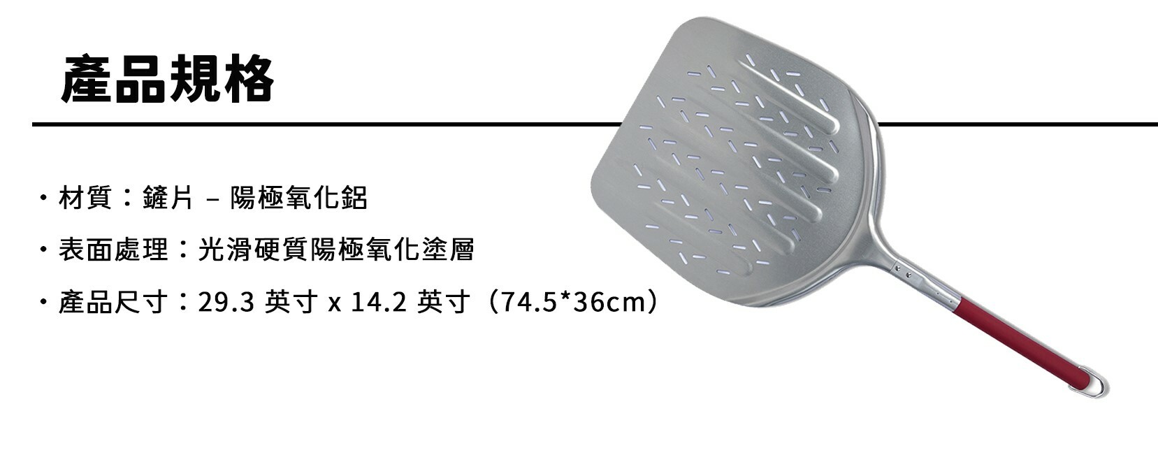 【Prokan 16”披薩鏟】由優質陽極氧化鋁製成,搭配穿孔設計,專為輕鬆滑動、翻轉和拿取披薩而設計。鏟子表面穿孔設計能夠迅速釋放蒸汽,多餘麵粉也可輕鬆地從披薩底部掉落,保持披薩酥脆美味。