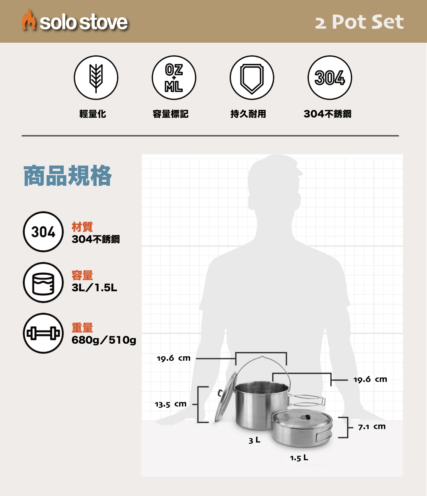 3公升鍋具附有吊掛用把手,可懸掛於三角架或高處提把上;二鍋鍋蓋上均設有蒸氣孔洞及側邊附有摺疊提把手柄以方便握取,Campfire不鏽鋼爐可收納於2 Pot Set雙鍋組內,便於攜帶並節省寶貴空間。