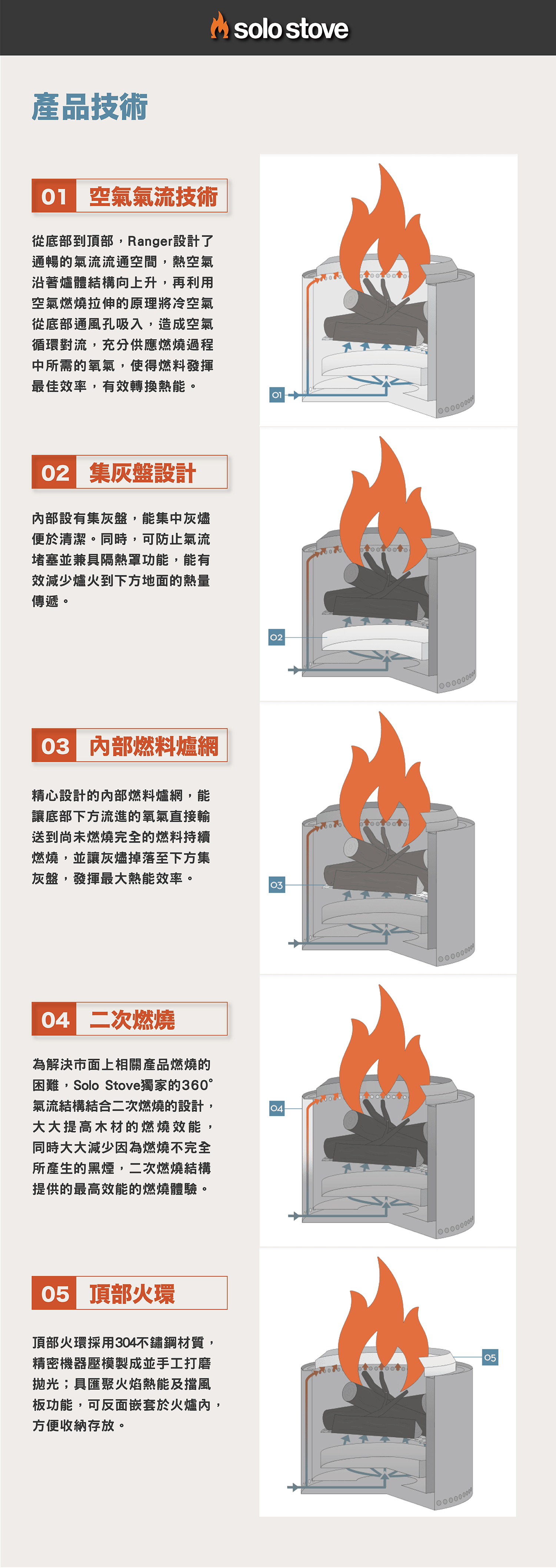SOLO STOVE獨特指標性的360° 氣流設計( AirflowDesign™) ,有著二次燃燒的極佳高熱效率,不易產生黑煙並可將木材燃料有效的燃燒殆盡,更加便於火爐清潔。