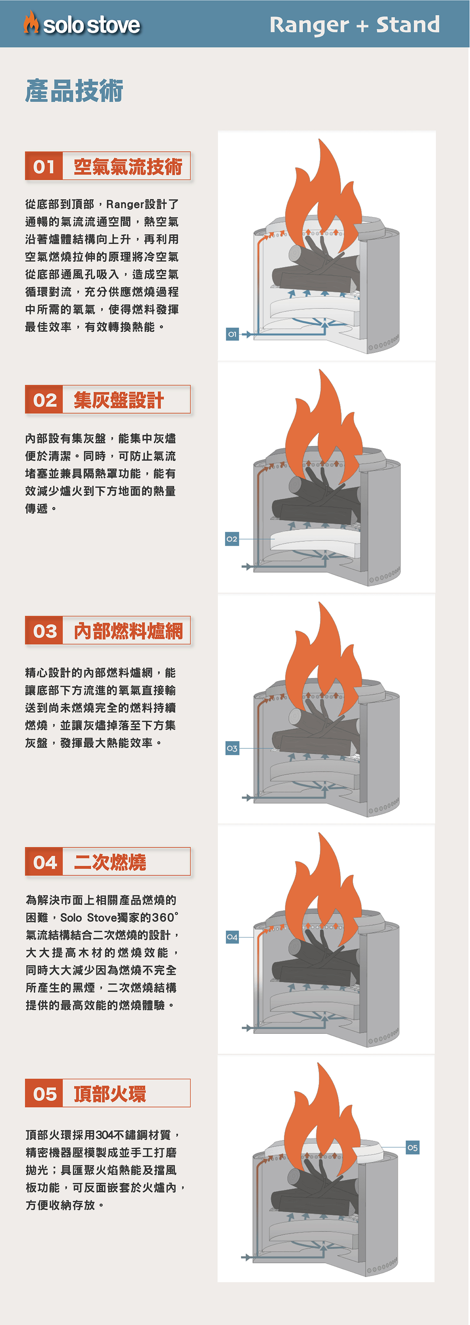SOLO STOVE獨特指標性的360° 氣流設計( AirflowDesign™) ,有著二次燃燒的極佳高熱效率,不易產生黑煙並可將木材燃料有效燃燒殆盡,更加便於火爐清潔。