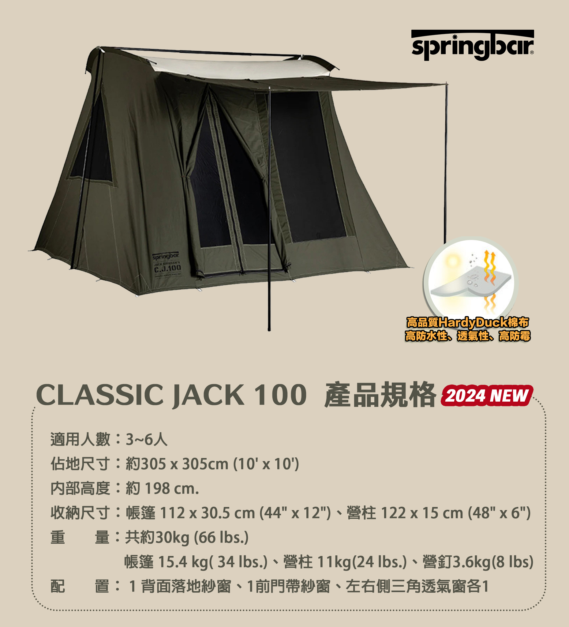 帳篷布料採用HardyDuck高防水性棉布(本體8.5oz, 帳頂10.1oz),搭配了取自於春帳傳統屋頂帳的經典米白色,向傳統經典致敬。