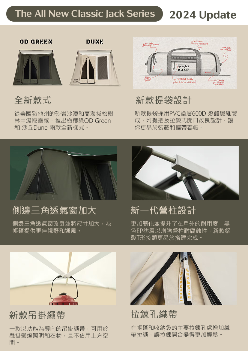 為了紀念春帳創辦人Jack家族,於1961年就開始投入足以抵抗極地或惡劣環境下的屋頂型帳篷研發,Springbar春帳推出【Classic Jack經典傑克復刻版系列】。2024推出全新改款經典傑克春帳系列,提供喜愛Springbar露友們,另一獨具風格的春帳選擇。