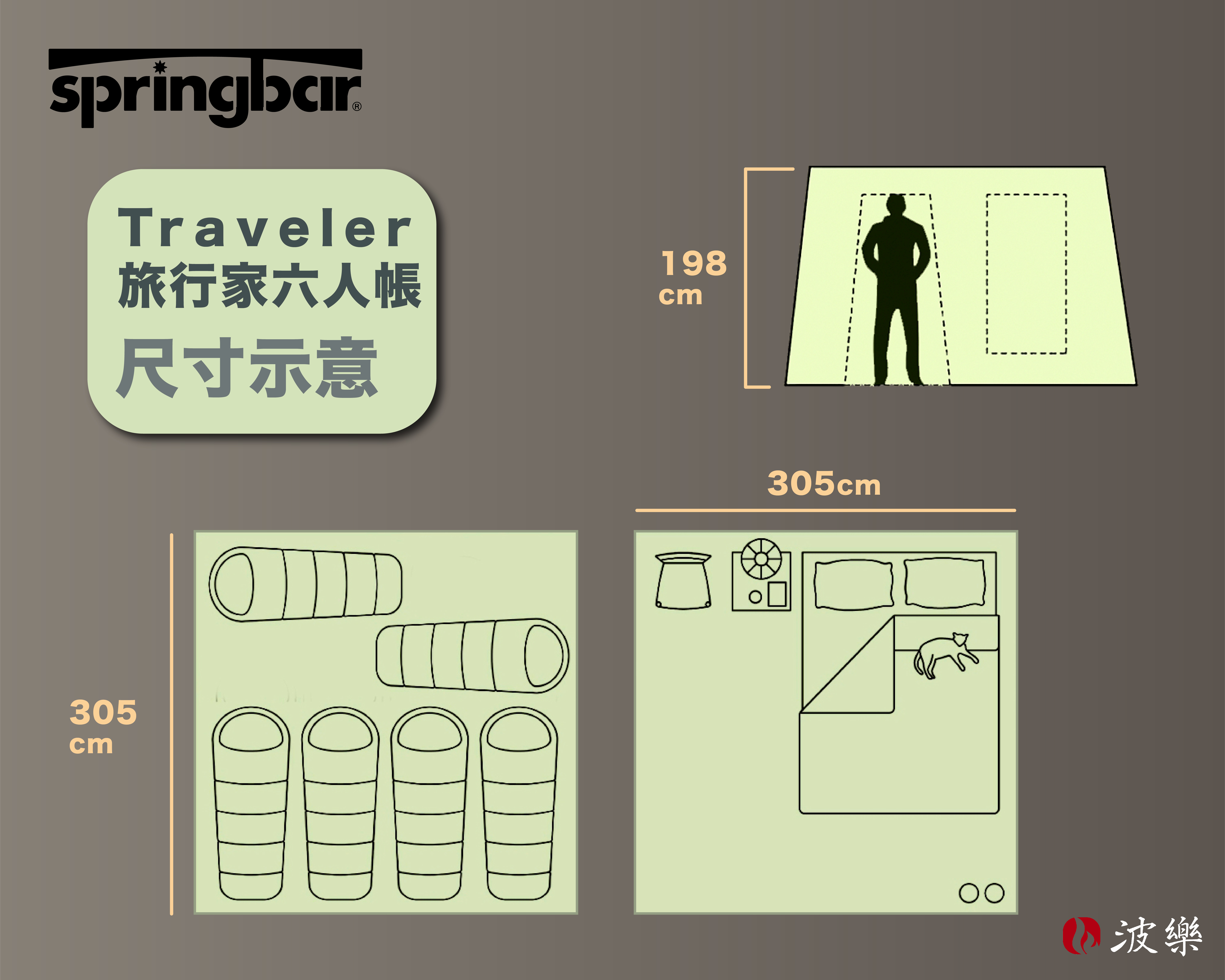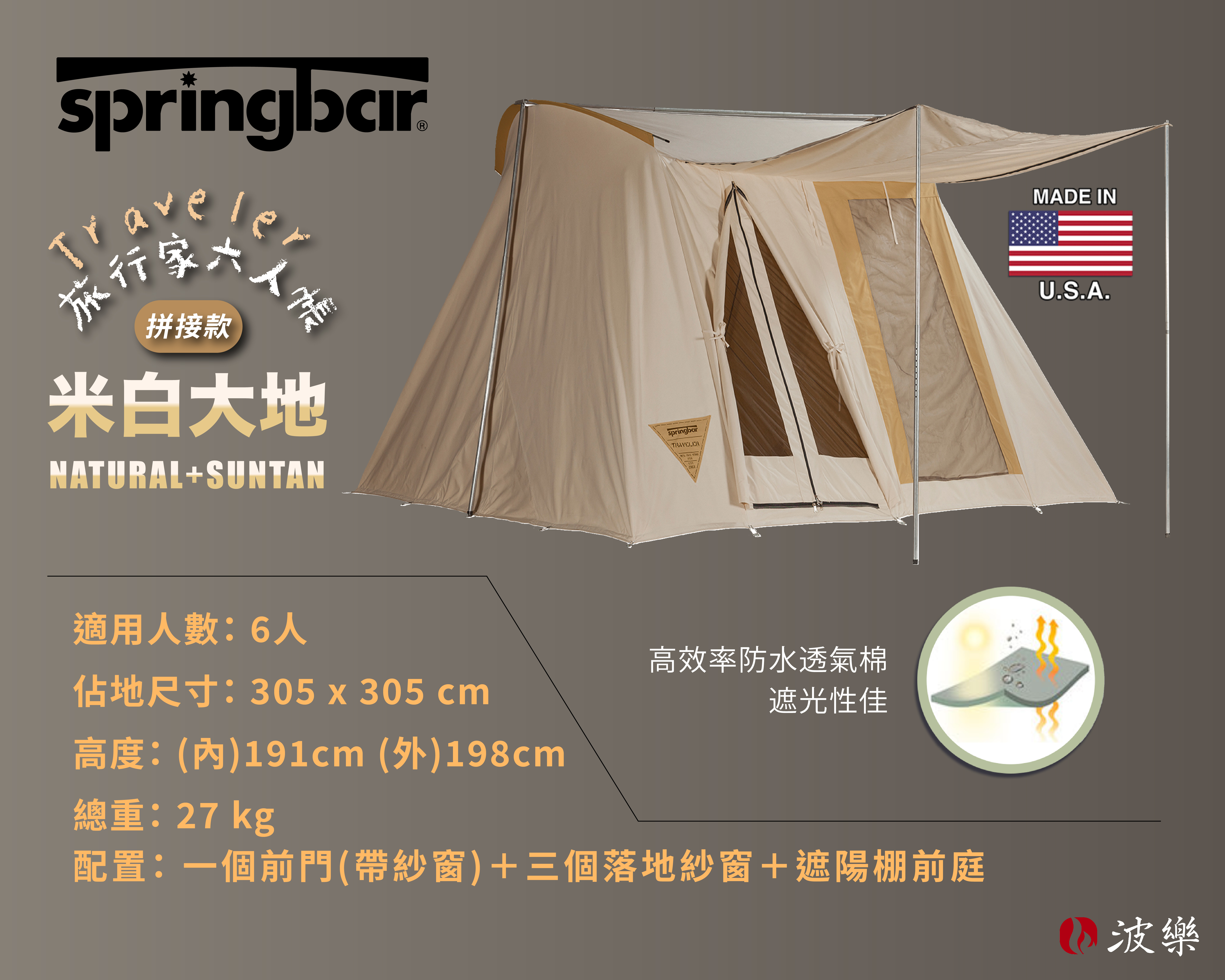 *帳篷底布採用防水、防霉、抗UV、抗菌的vinyl-laminated polyester超強化布料,這種超強化布料更可抗磨損、防刺穿(但不可以使用尖銳物故意損壞),搭配Springbar原廠地布更可有效的隔絕地面濕氣、不讓帳篷主體沾附過多泥垢以便於清潔來延長帳篷壽命。