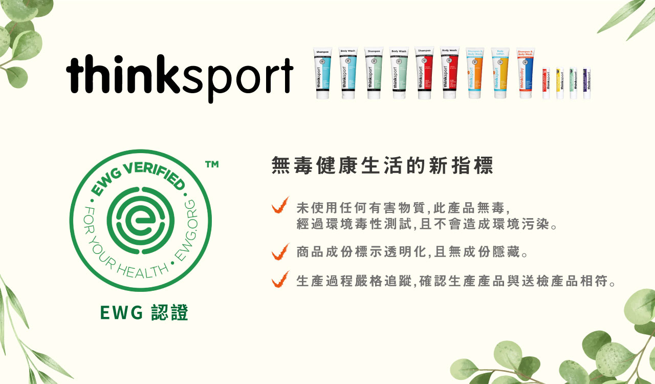 Thinksport/Thinkbaby沐浴乳/洗髮精系列產品均通過最具公信力的美國環保工作組織EWG嚴格檢驗,所有成分均獲得EWG的0或1最高等級(低危害),安全不含任何有害化學物質,適合全家大小使用。