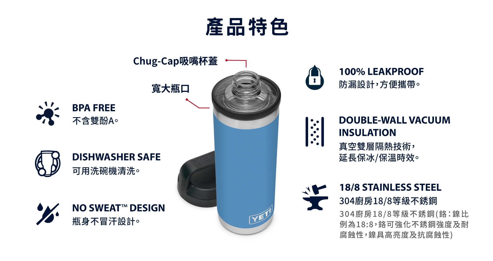 不論是晨起運動、戶外健行、水上活動和日常通勤時,記得都要多補充水份。採用真空雙城隔熱技術,有效保持內裝飲品保冰/保溫時效,搭配防摔的獨特Chug-Cap吸嘴杯蓋 ,方便飲用。多款顏色選擇,讓您隨手一瓶,與眾不同。瓶身及瓶蓋均可置放於洗碗機清洗,便於清潔。