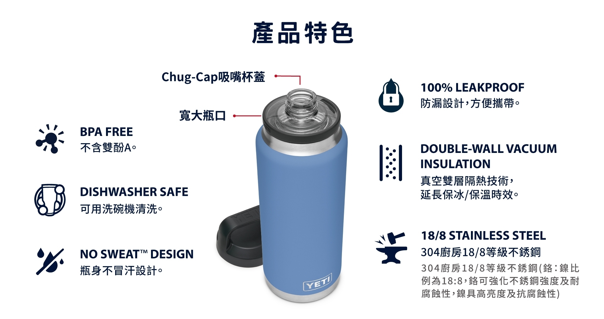 不論是晨起運動、戶外健行、水上活動和日常通勤時,記得都要多補充水份。採用真空雙城隔熱技術,有效保持內裝飲品保冰/保溫時效,搭配防摔的獨特Chug-Cap吸嘴杯蓋 ,方便飲用。瓶身及瓶蓋均可置放於洗碗機清洗,便於清潔。