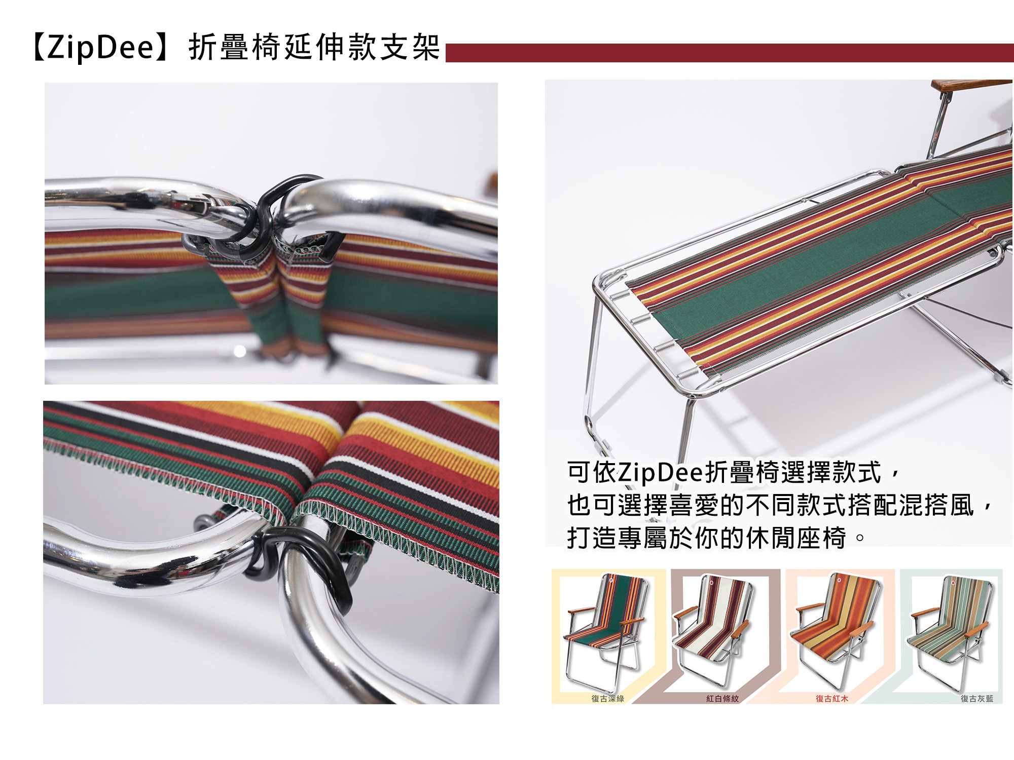 專為你喜愛的【ZipDee】戶外輕量折疊椅所打造設計,可將折疊椅搖身一變成舒適、耐用的躺椅,讓雙腳獲得充分休息,不論是居家或戶外使用都能輕鬆體驗生活樂趣。可依你的ZipDee折疊椅選擇款式,也可選擇你喜愛的不同款式搭配混搭風,打造專屬於你的休閒座椅。